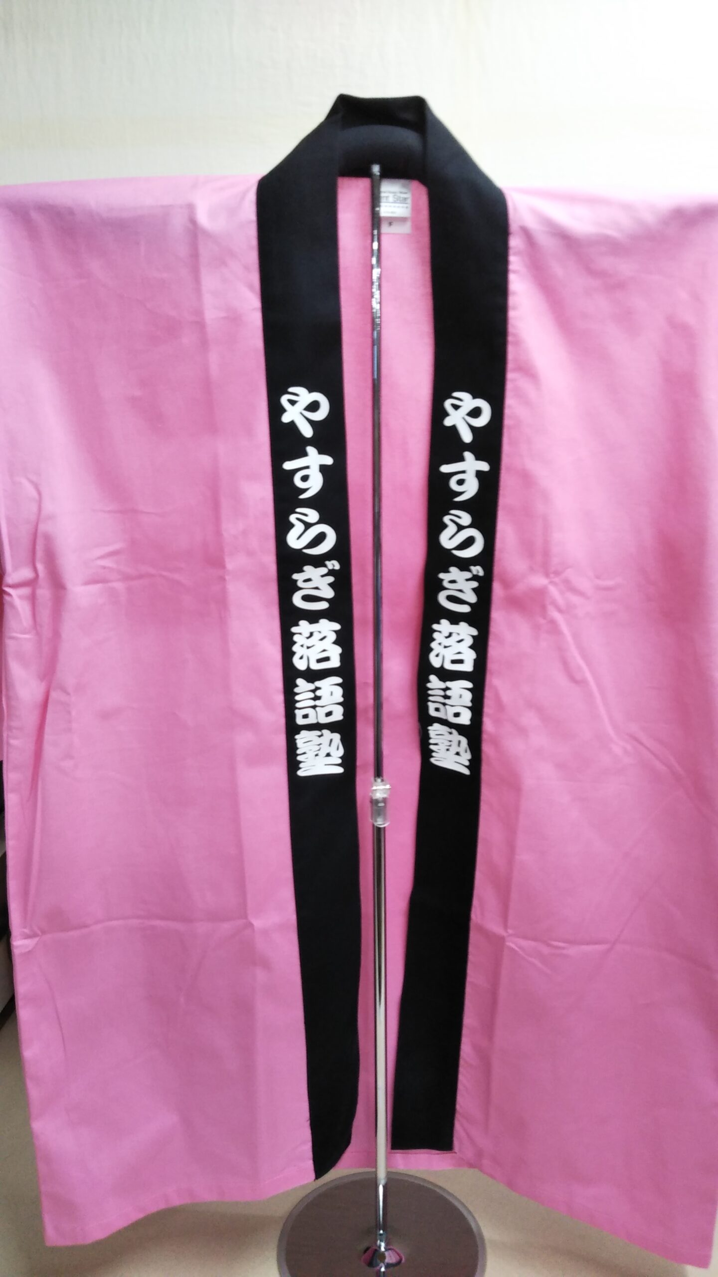 「やすらぎ落語塾」オリジナルはっぴ制作事例 商品カテゴリ: 1 商品: 241 利用シーン: 加工位置: 両衿 加工サイズ: 横:40mm×縦:304mm 加工方法: シルクプリント カメオカからのコメント: 程良い厚みのコットンを使用したイベントはっぴの 両衿に文字プリントを入れました。はっぴでは定番のスタイルです。フォントは勘亭流を使用しており、和の雰囲気が出ています。