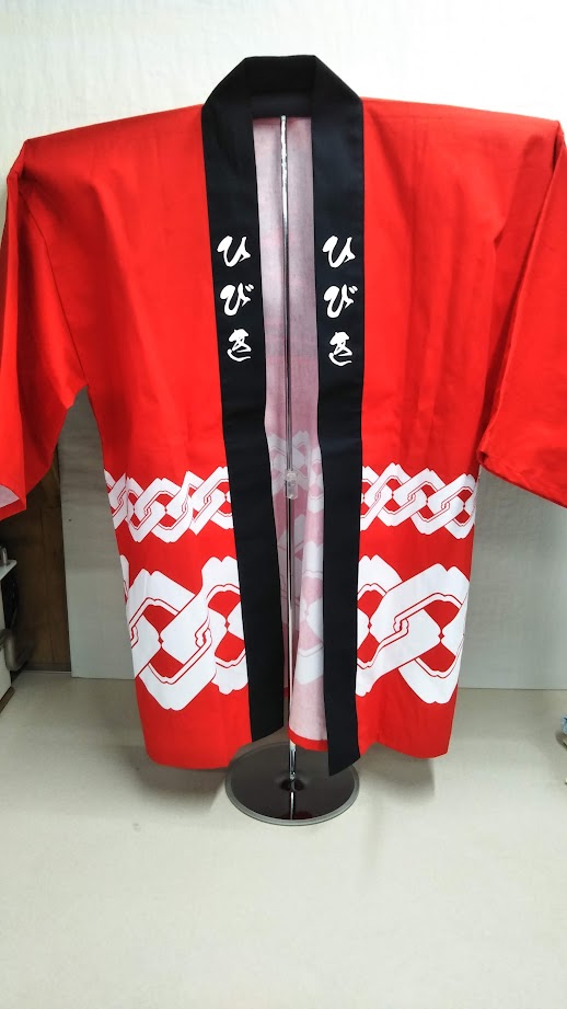 「ひびき」オリジナルはっぴ制作事例 商品カテゴリ: 1 商品: 272 利用シーン: 加工位置: 両衿・背中 加工サイズ: 横:40mm × 縦:145mm 横:270mm × 縦:272mm 加工方法: プリント カメオカからのコメント: