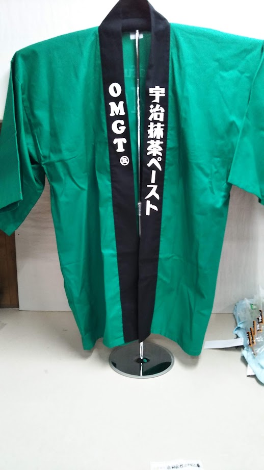 「OMGTⓇ宇治抹茶ペースト」オリジナルはっぴ制作事例 商品カテゴリ: 1 商品: 278 利用シーン: 加工位置: 両衿・背中 加工サイズ: 横:40mm × 縦:mm 横:300mm × 縦:118mm 加工方法: プリント カメオカからのコメント: