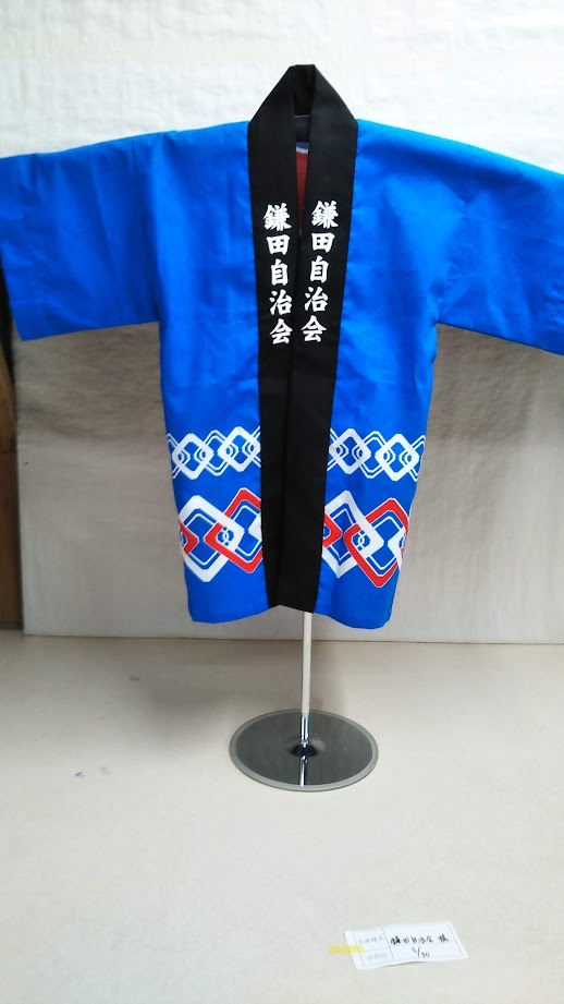 「鎌田自治会」オリジナルはっぴ制作事例 商品カテゴリ: 1 商品: 271 利用シーン: 加工位置: 両衿 加工サイズ: 横:30mm × 縦:150mm 加工方法: プリント カメオカからのコメント: