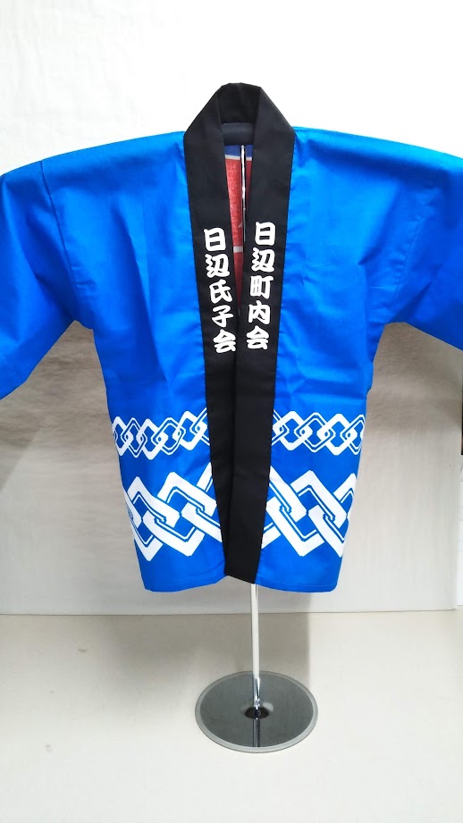 「日辺氏子会 日辺町内会」オリジナルはっぴ制作事例 商品カテゴリ: 1 商品: 271 利用シーン: 加工位置: 両衿 加工サイズ: 横:30mm × 縦:162mm 加工方法: プリント カメオカからのコメント: