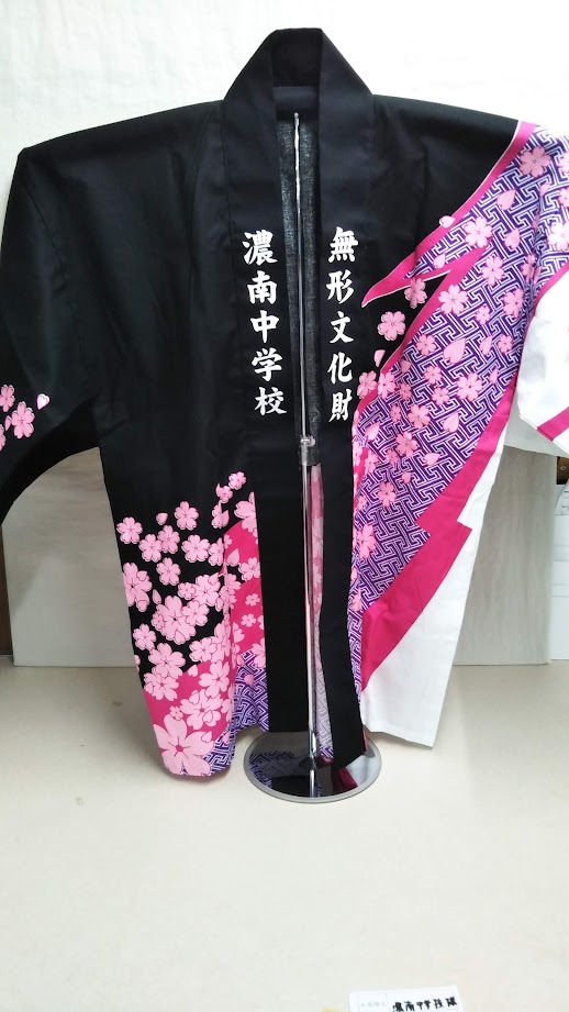 「濃南中学校 無形文化財」オリジナルはっぴ制作事例 商品カテゴリ: 1 商品: 274 利用シーン: 加工位置: 両衿 加工サイズ: 横:40mm × 縦:221mm 加工方法: プリント カメオカからのコメント: