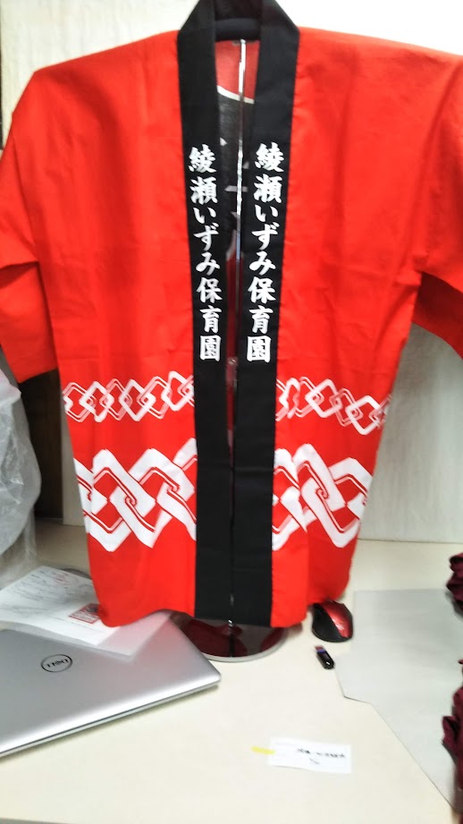 「綾瀬いずみ保育園」オリジナルはっぴ制作事例 商品カテゴリ: 1 商品: 271 利用シーン: 加工位置: 両衿 加工サイズ: 横:40mm × 縦:310mm 加工方法: プリント カメオカからのコメント: