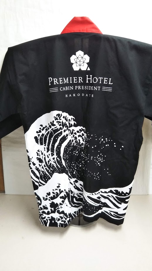 「PREMIER HOTEL CABIN PRESIDENT」オリジナルはっぴ制作事例 商品カテゴリ: 1 商品: 279 利用シーン: 加工位置: 背中 加工サイズ: 横:300mm × 縦:184mm 加工方法: プリント カメオカからのコメント: