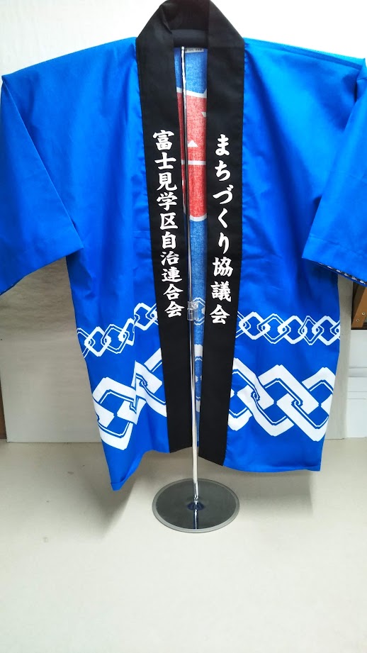 「富士見学区自治連合会 まちづくり協議会」オリジナルはっぴ制作事例 商品カテゴリ: 1 商品: 271 利用シーン: 加工位置: 両衿 加工サイズ: 横:40mm × 縦:349mm 加工方法: プリント カメオカからのコメント: