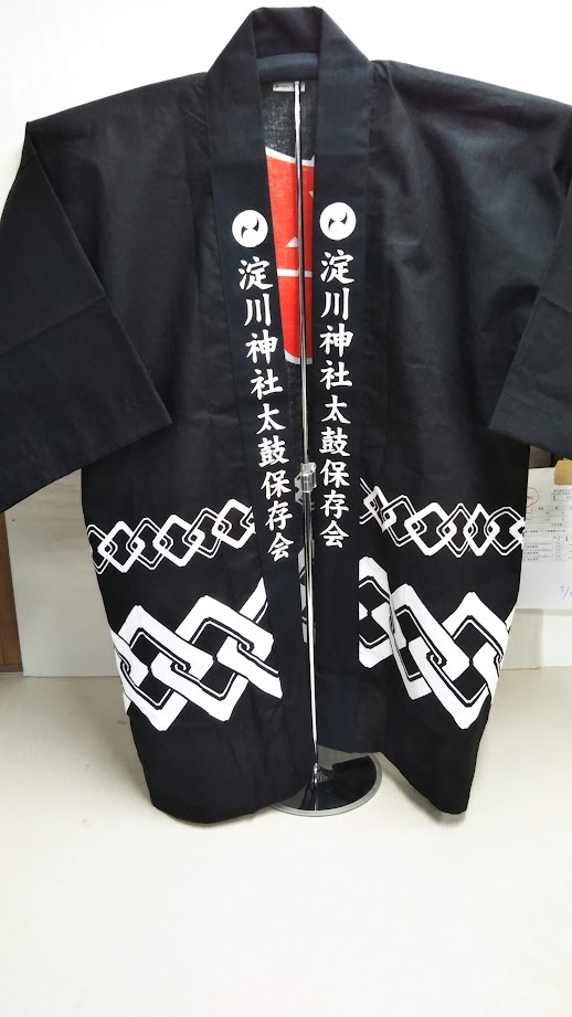 「淀川神社太鼓保存会」オリジナルはっぴ制作事例 商品カテゴリ: 1 商品: 271 利用シーン: 加工位置: 両衿 加工サイズ: 横:40mm × 縦:430mm 加工方法: プリント カメオカからのコメント: