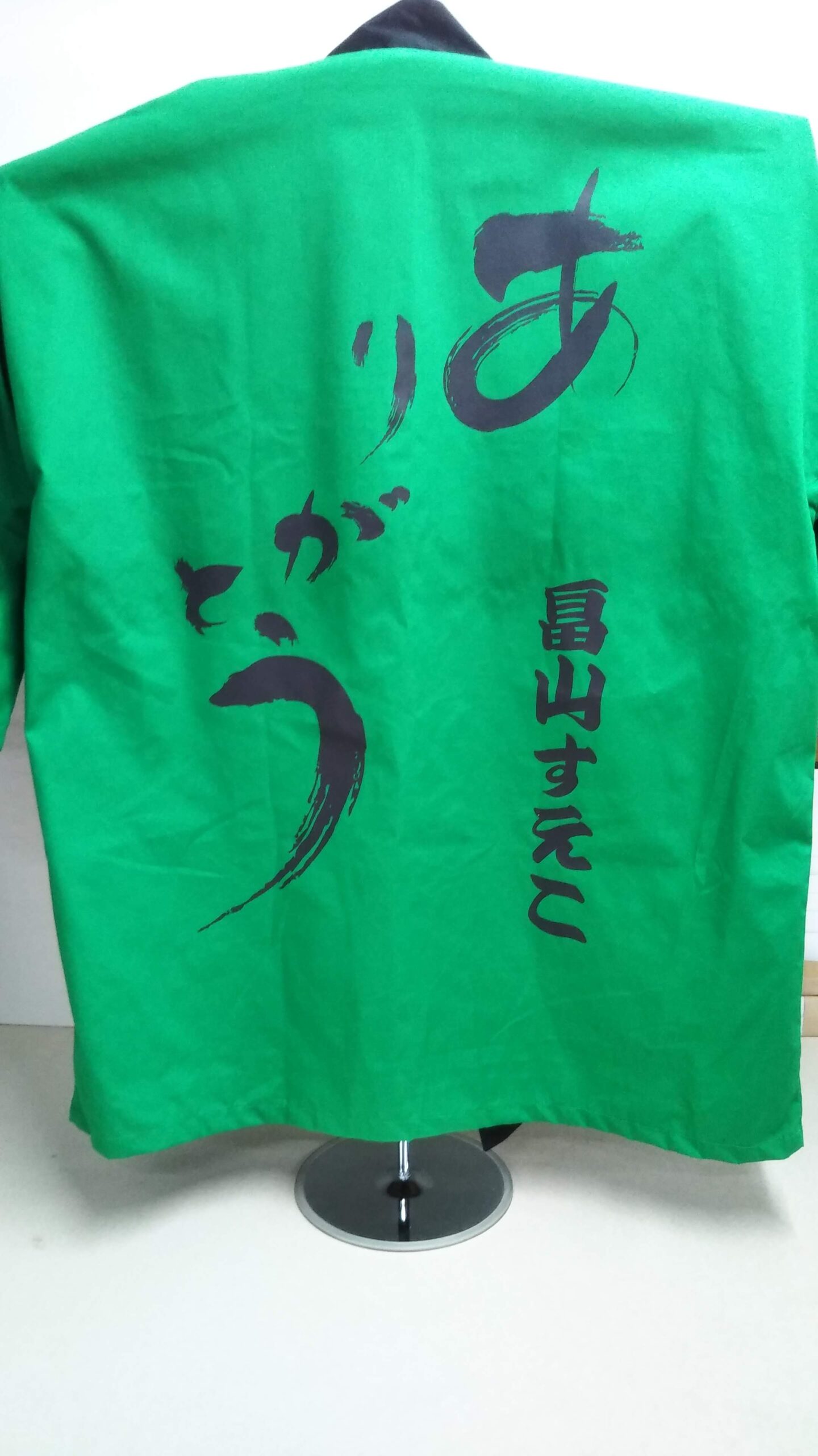 「畠山すえこ ありがとう」オリジナルはっぴ製作事例 オリジナルプリント DSC_4428 DSC_4429 DSC_4431 商品カテゴリ: 1 商品: 285 利用シーン: 加工位置: 両衿・背中 加工サイズ: 衿:横40㎜×縦278㎜ 背中:横363㎜×縦600㎜ 加工方法: プリント カメオカからのコメント: