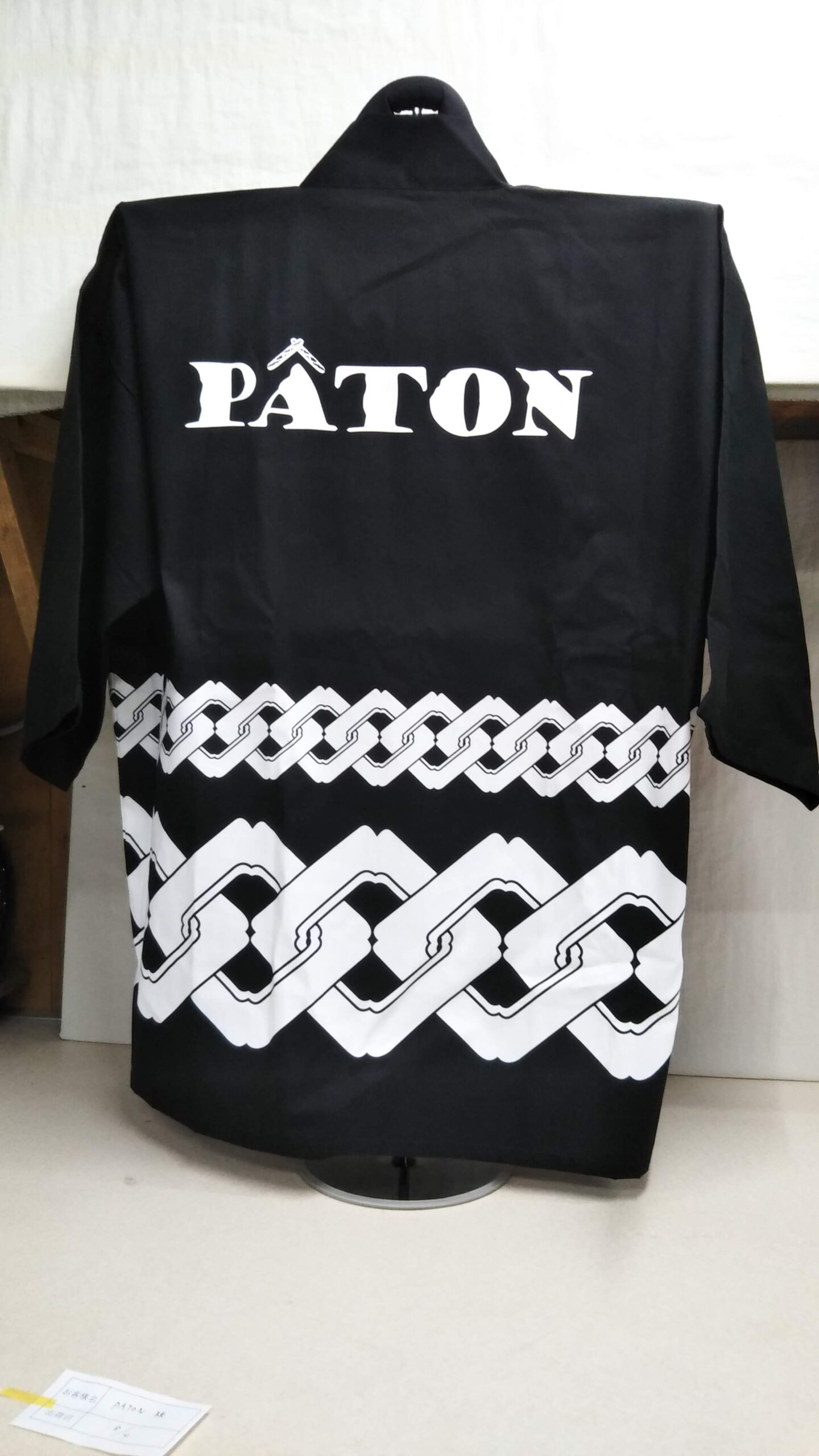 「PATON」オリジナルはっぴ制作事例 DSC_0597 商品カテゴリ: 1 商品: 利用シーン: 加工位置: 背中 加工サイズ: 横:340㎜×縦:75㎜ 加工方法: プリント カメオカからのコメント: