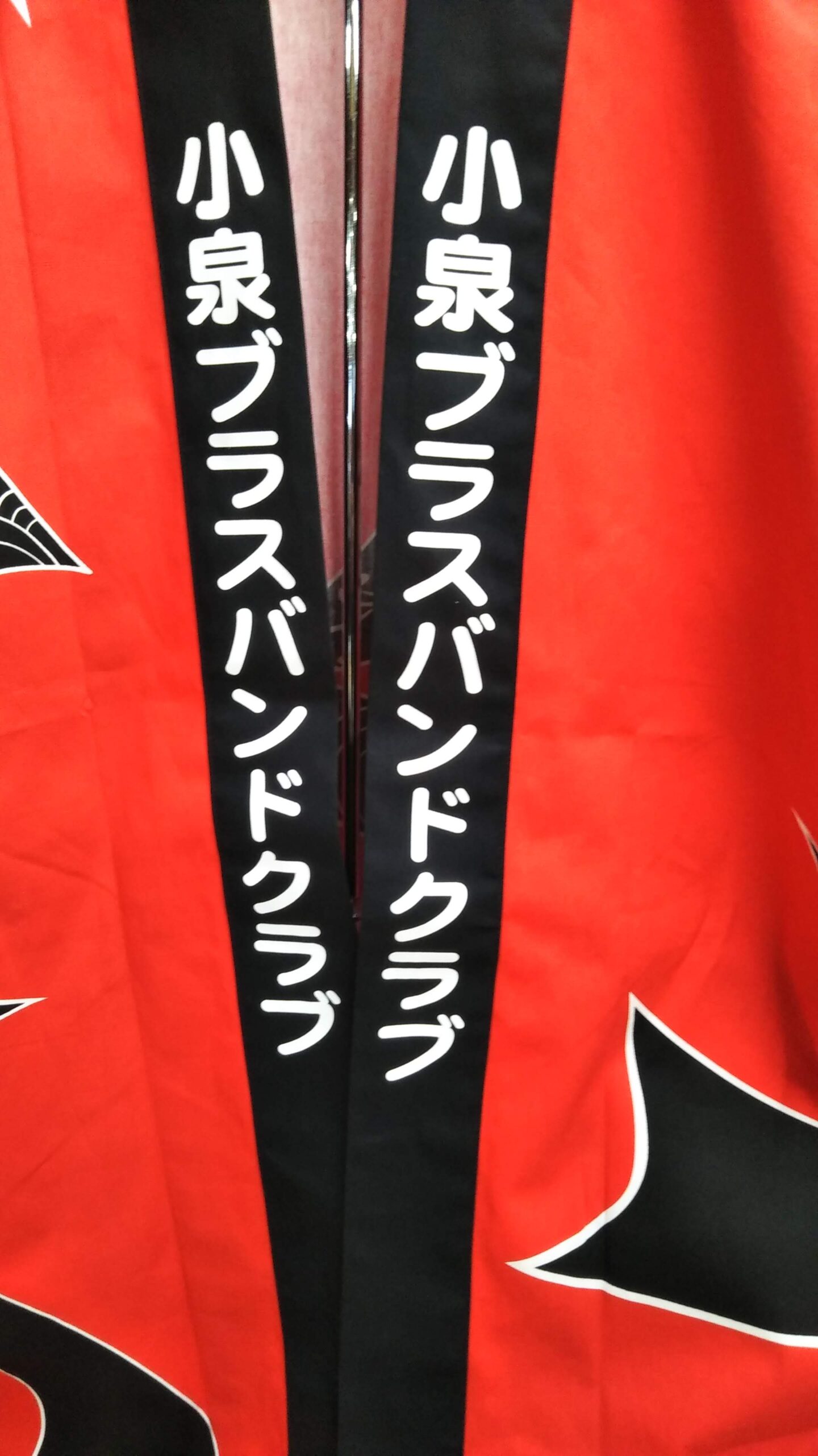 「小泉ブラスバンドクラブ」オリジナルはっぴ制作事例 DSC_1277 商品カテゴリ: 1 商品: 利用シーン: 加工位置: 両衿 加工サイズ: 横:40㎜×縦:400㎜ 加工方法: プリント カメオカからのコメント: