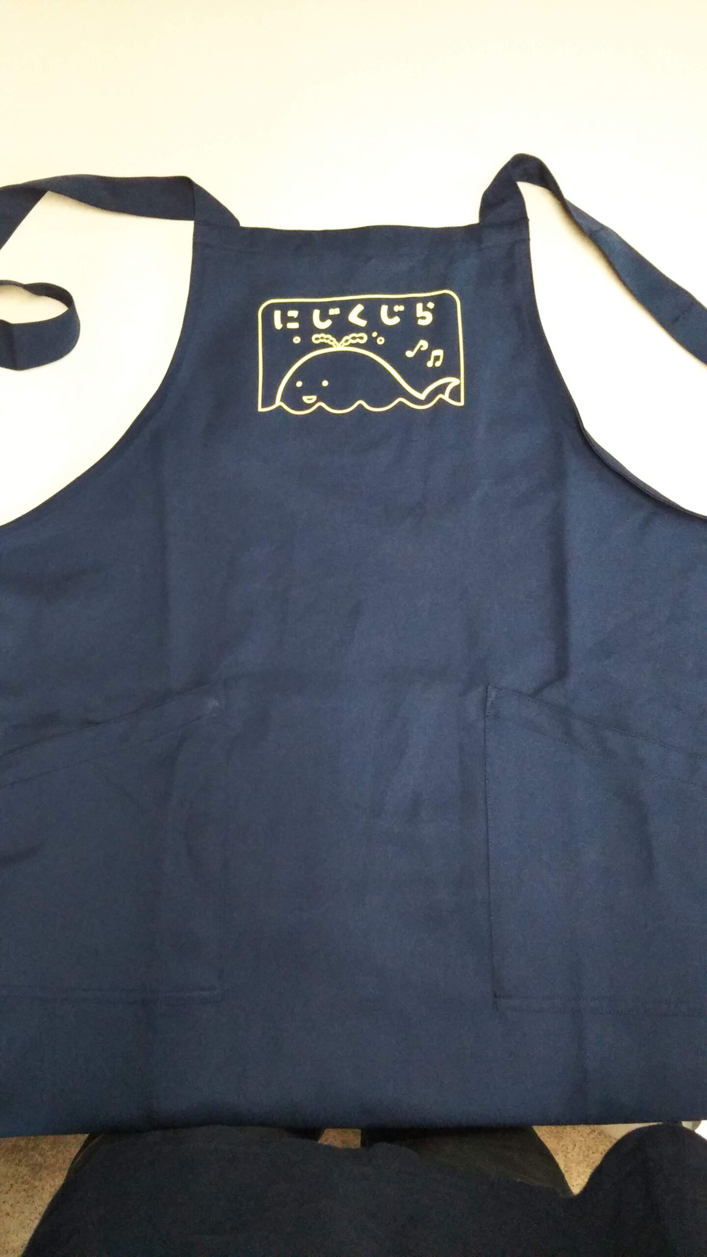 「にじくじら」オリジナルエプロン制作事例 DSC_3891 商品カテゴリ: 12 商品: 1603 利用シーン: 加工位置: 胸前面 加工サイズ: 横:150㎜×縦:90㎜ 加工方法: プリント カメオカからのコメント: