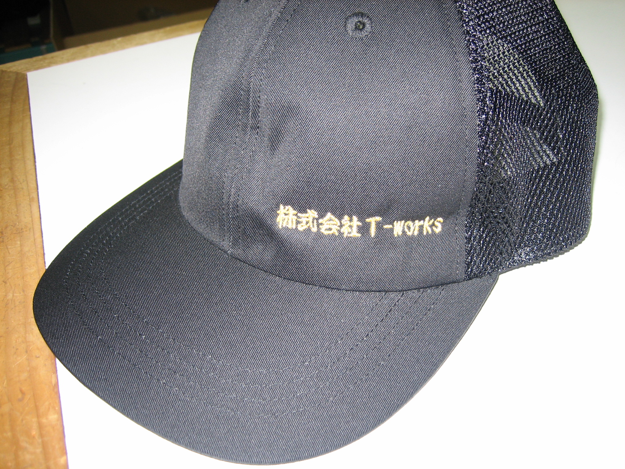 「T-works」オリジナルキャップ制作事例 商品カテゴリ: 98 商品: 利用シーン: 加工位置: フロント向かって右下 加工サイズ: 横:90mm×縦:10mm 加工方法: 刺繍 カメオカからのコメント: