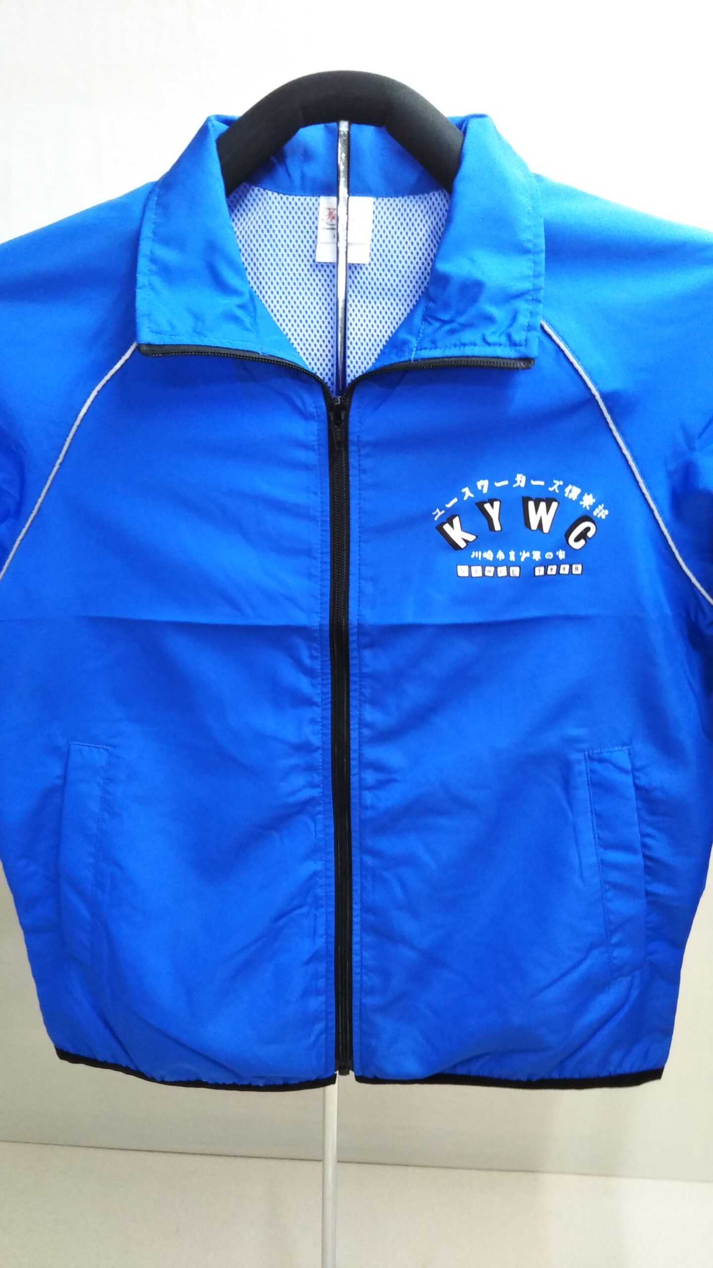 「KYWC」オリジナルジャケット制作事例 DSC_0008 商品カテゴリ: 3 商品: 387 利用シーン: 加工位置: 左胸 加工サイズ: 横:100mm 加工方法: プリント カメオカからのコメント: 大人気商品リフレクスポーツジャケットの左胸にプリントをしました。ブルー色のジャケットにピッタリ合ったプリントカラーです。細かいデザインですがきれいに仕上げる事が出来ました。