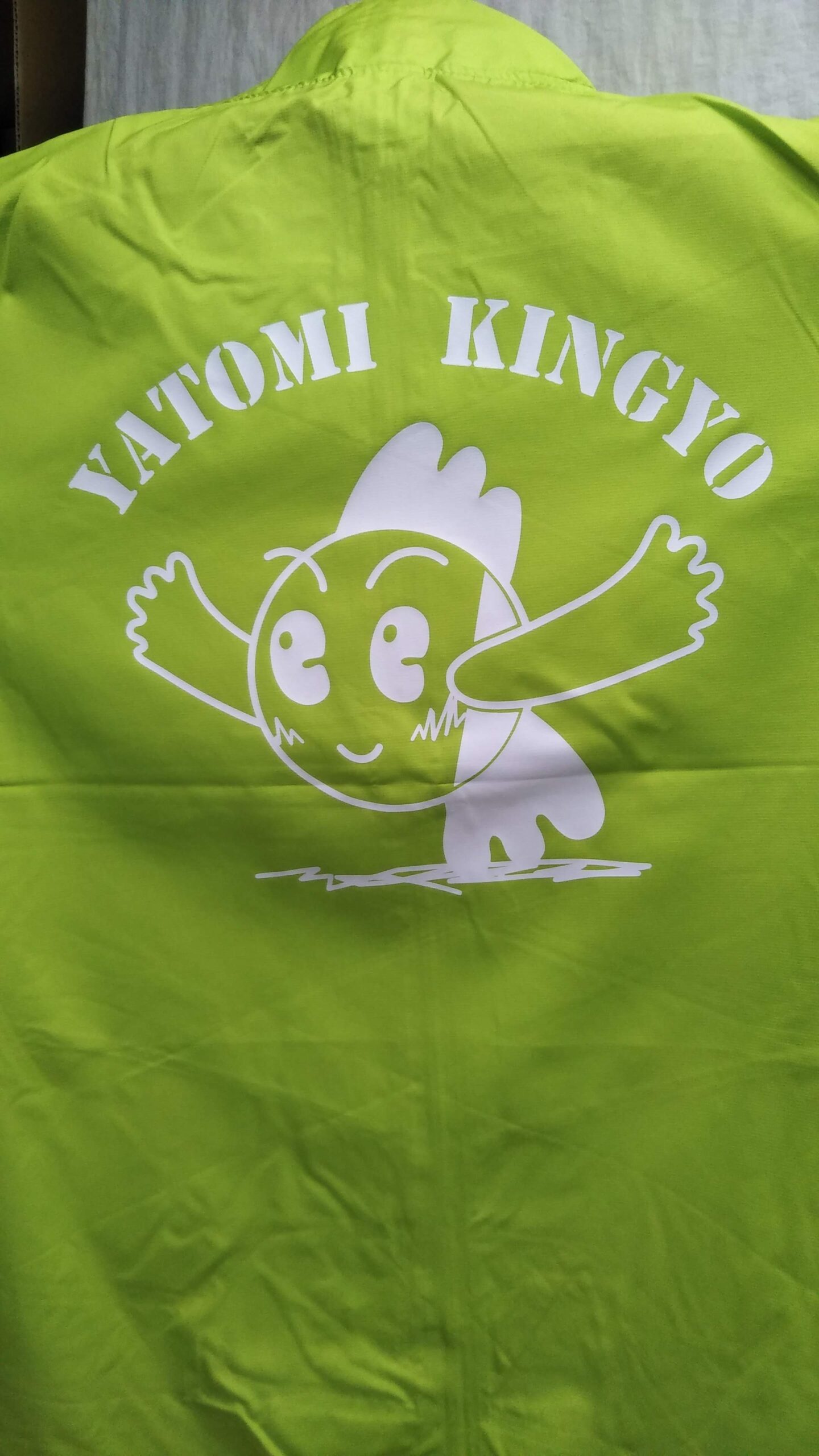 「YATOMI KINGYO」オリジナルジャケット制作事例 DSC_4176 商品カテゴリ: 3 商品: 1286 利用シーン: 加工位置: 背中 加工サイズ: 横:300㎜×縦:260㎜ 加工方法: プリント カメオカからのコメント: