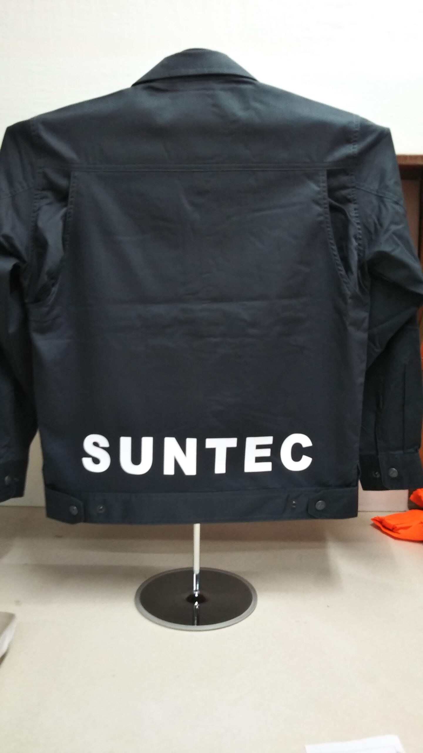 「SUNTEC」オリジナルジャンパー制作事例 DSC_0849 商品カテゴリ: 98 商品: 利用シーン: 加工位置: 背中裾 加工サイズ: 横:350㎜×縦:56㎜ 加工方法: プリント カメオカからのコメント: