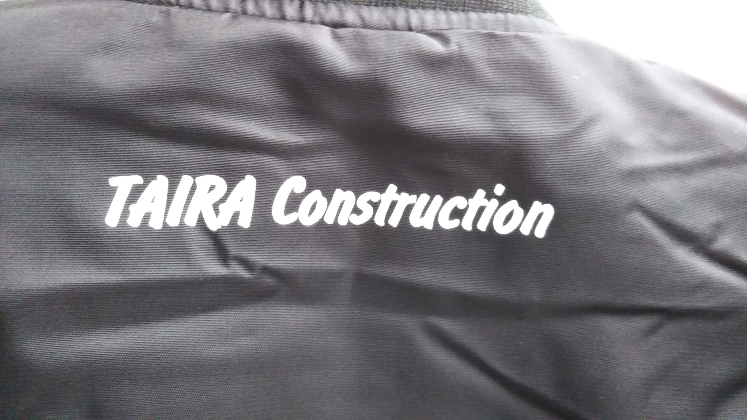 「TAIRA Construction」オリジナルジャンパー制作事例 DSC_0101 商品カテゴリ: 3 商品: 1283 利用シーン: 加工位置: 背中衿下 加工サイズ: 横:100㎜ 加工方法: プリント カメオカからのコメント: 人気のMA-1タイプブルゾンです。背中衿下へシンプルに1色プリントを入れました。フォントはフラッシュライト体を使用しています。