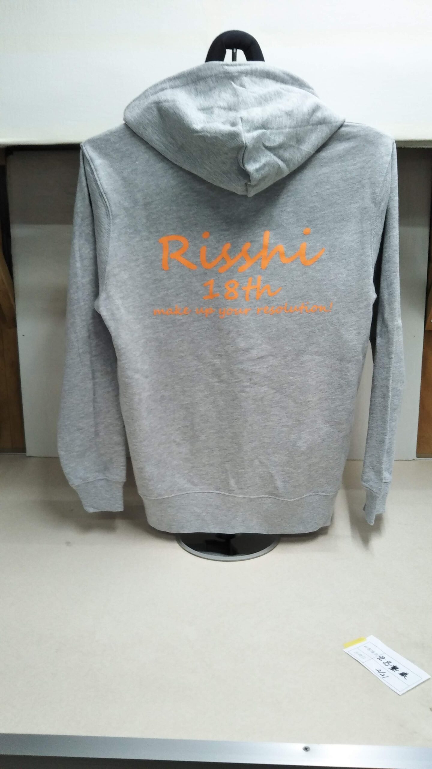 「Risshi18th」オリジナルパーカー制作事例 DSC_1409 商品カテゴリ: 7 商品: 596 利用シーン: 加工位置: 背中 加工サイズ: 横:300㎜×縦:141㎜ 加工方法: プリント カメオカからのコメント: