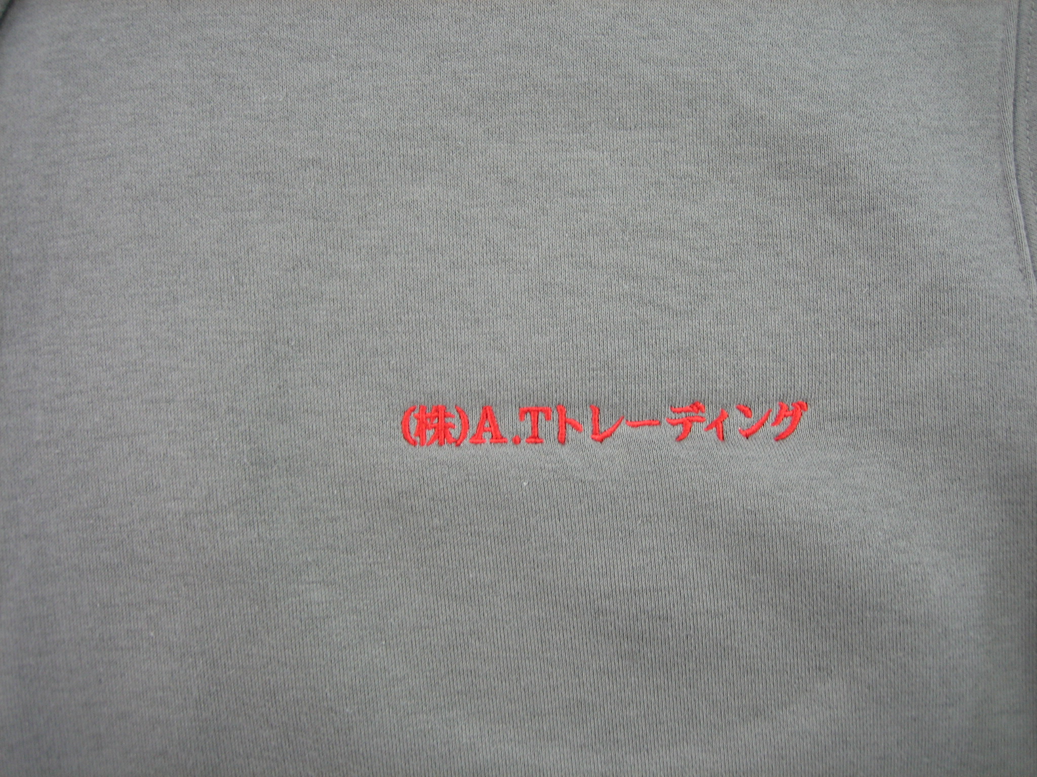 「(株)A.Tトレーディング」オリジナルパーカー制作事例 商品カテゴリ: 7 商品: 2635 利用シーン: 加工位置: 左胸 加工サイズ: 横:100mm×縦:11mm 加工方法: 刺繍 カメオカからのコメント: