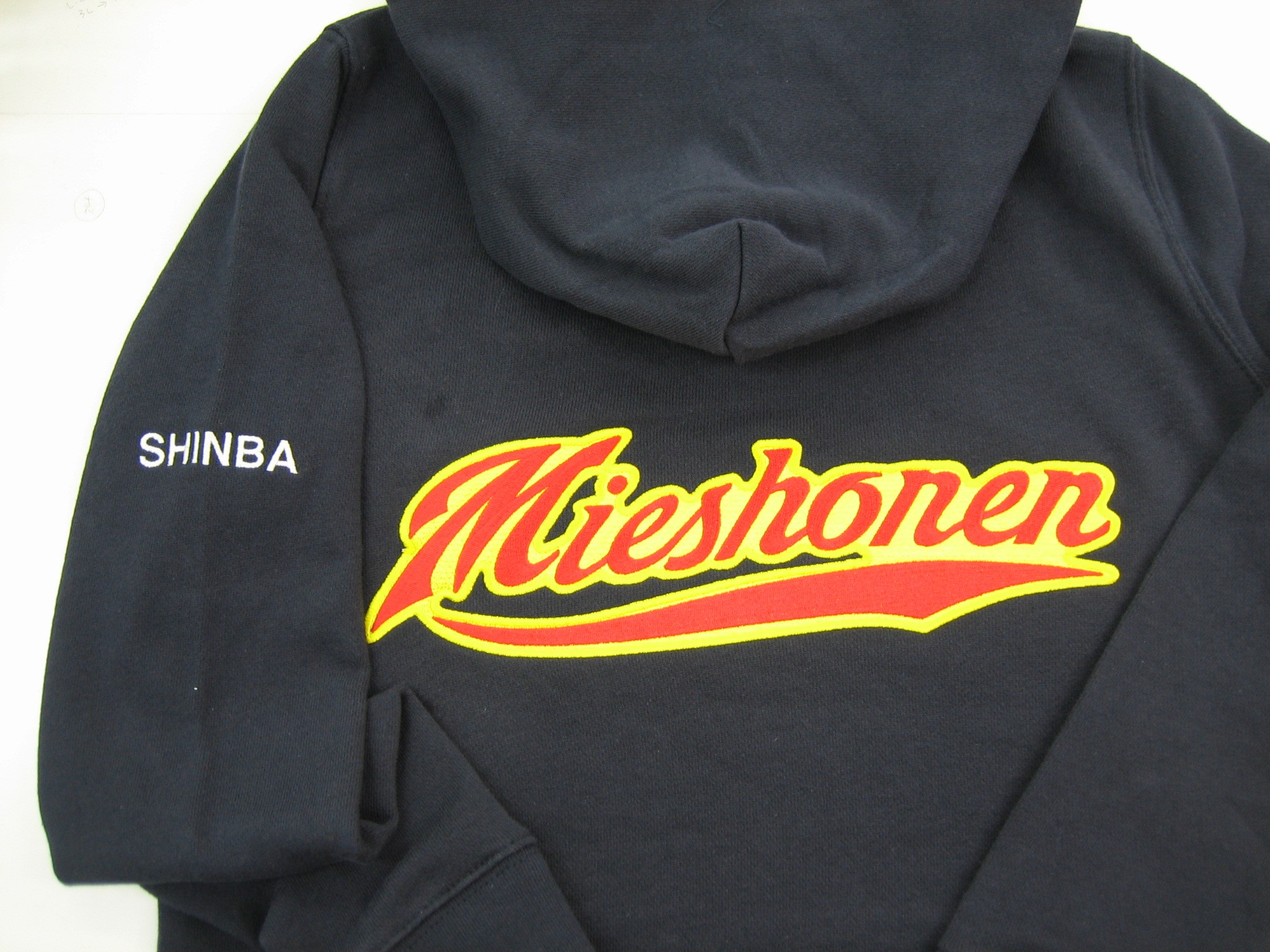 「Mieshonen SHINBA」オリジナルパーカー制作事例 商品カテゴリ: 7 商品: 594 利用シーン: 加工位置: 背中 加工サイズ: 横:300mm×縦:92mm 加工方法: 刺繍 カメオカからのコメント: