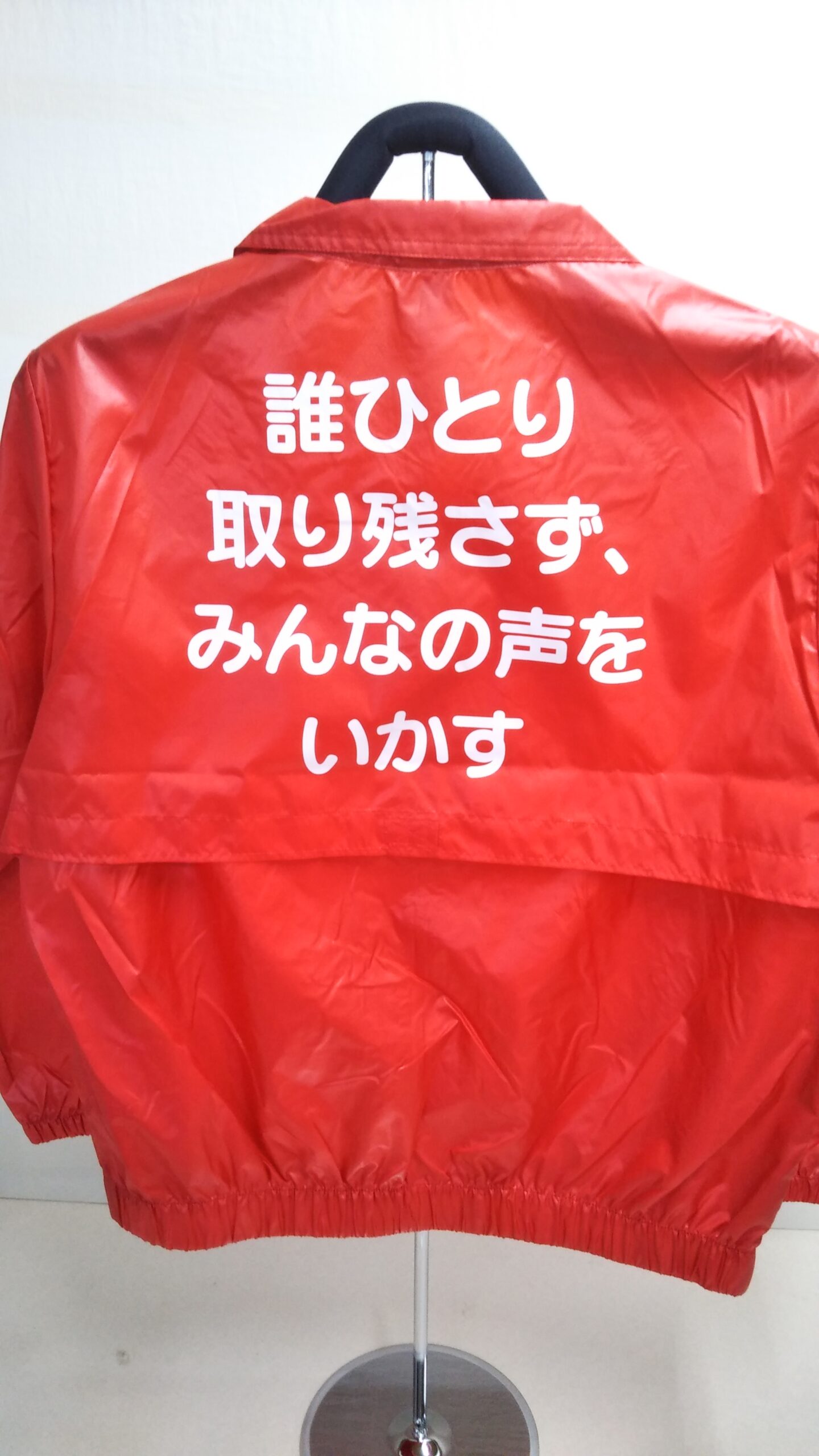 「誰ひとり取り残さず、みんなの声をいかす」オリジナルブルゾン制作事例 商品カテゴリ: 3 商品: 377 利用シーン: 加工位置: 背中 加工サイズ: 横:290mm×縦:253mm 加工方法: シルクプリント カメオカからのコメント: 背中に大きくプリントをしました。一文字が大きくとても読みやすいプリントです。フォントは太めの丸ゴシック体を使用してます。