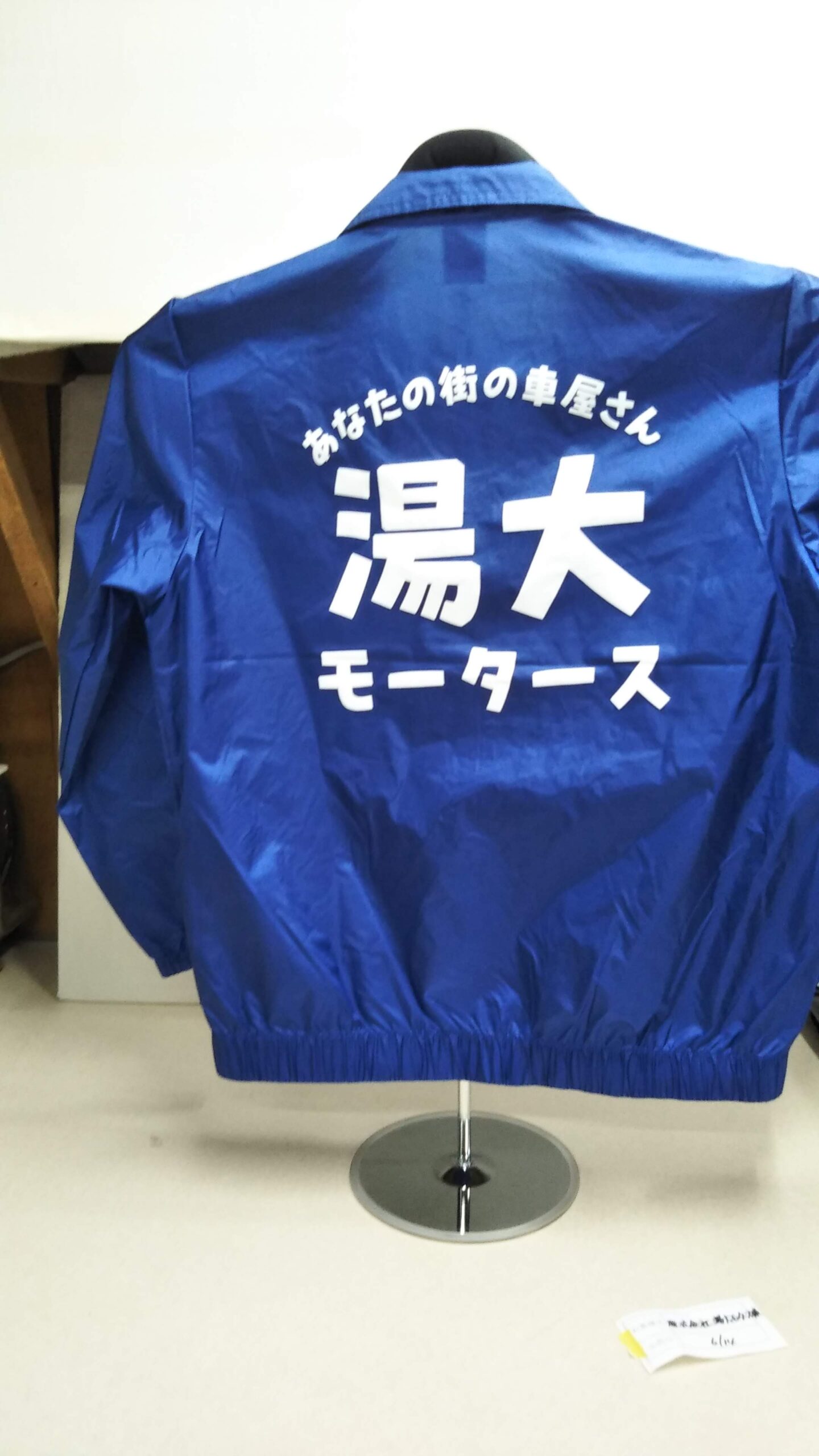 「湯大モータース」オリジナルブルゾン制作事例 商品カテゴリ: 3 商品: 370 利用シーン: 加工位置: 背中 加工サイズ: 横:270mm×縦:250mm 加工方法: プリント カメオカからのコメント: