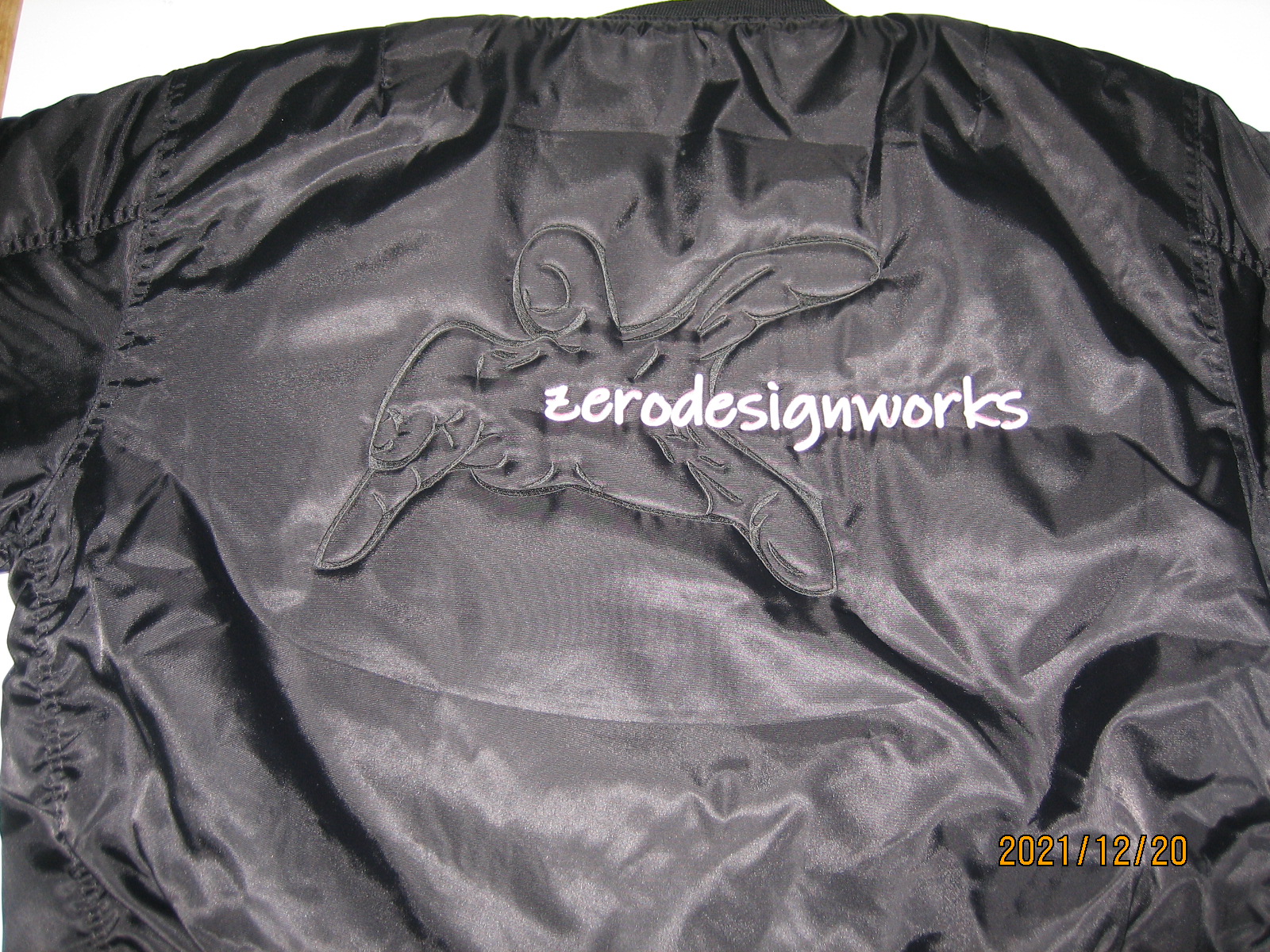 「zerodesignworks」オリジナルブルゾン制作事例 商品カテゴリ: 3 商品: 413 利用シーン: 加工位置: 背中 加工サイズ: 横:340㎜×縦:189㎜ 加工方法: オリジナル刺繍 カメオカからのコメント: 冬の大人気アイテムMA-1ブルゾン背中に刺繍を入れました。ブラック本体に黒糸で刺繍をしてます。糸の光沢感でデザインを表現していて高級感ある仕上がりとなりました。