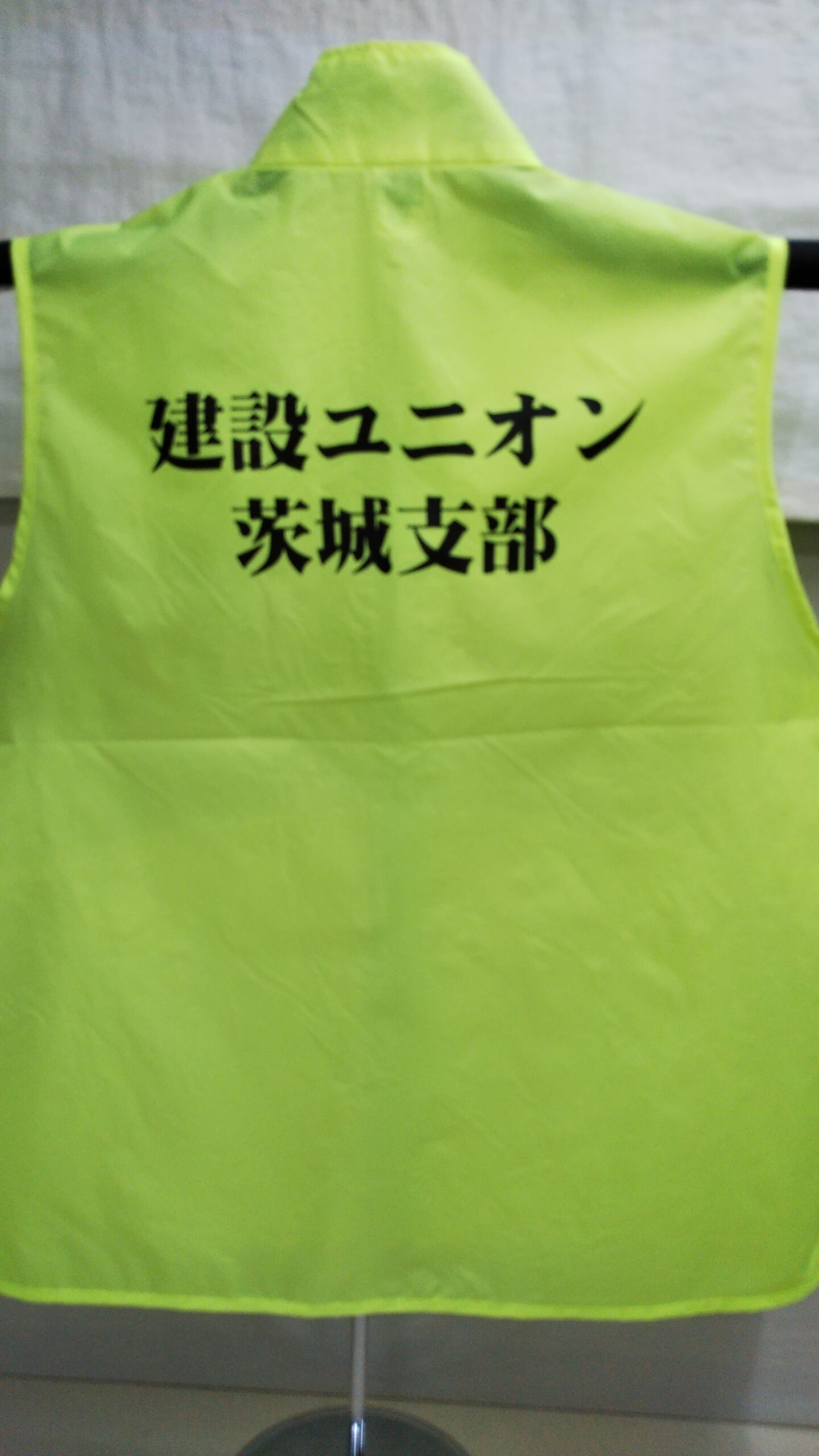 「建設ユニオン茨城支部」オリジナルベスト製作事例 DSC_0010 商品カテゴリ: 3 商品: 利用シーン: 130 加工位置: 左胸・背中 加工サイズ: 左胸:横80㎜ 背中:横280㎜ 加工方法: オリジナルシルクプリント カメオカからのコメント: 00008-NEVベーシックカラーベストの左胸と背中にオリジナルプリントを入れました。こちらのベストはイベント等で目印用として使用されることが多いです。プリントフォントは明朝体を使用しています。