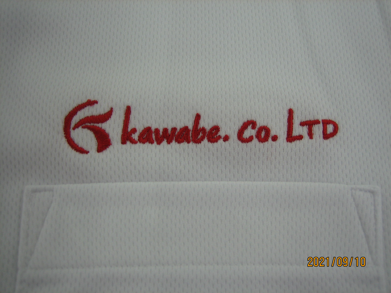 「kawabe. Co. LTDロゴ」オリジナルポロシャツ制作事例 商品カテゴリ: 4 商品: 503 利用シーン: 130 加工位置: 左胸 加工サイズ: 横90㎜×縦17㎜ 加工方法: オリジナル刺繡 カメオカからのコメント: 大人気アイテム00330-AVPドライポロシャツポケット付の左胸にオリジナル刺繍を入れました。ホワイトポロシャツに赤刺繍がとても映えますね。ロゴマークもとてもカッコいいです!