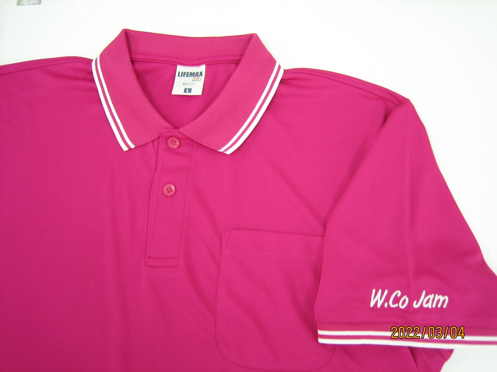 「W.Co Jam」オリジナルポロシャツ制作事例 商品カテゴリ: 4 商品: 2810 利用シーン: 加工位置: 左袖 加工サイズ: 横:70mm×縦:15mm 加工方法: 刺繍 カメオカからのコメント: