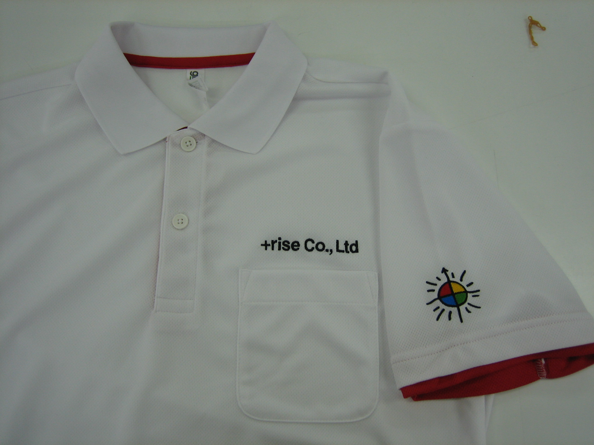 「+rise Co.,Ltd」オリジナルポロシャツ制作事例 商品カテゴリ: 4 商品: 524 利用シーン: 加工位置: 左胸・左袖 加工サイズ: 左胸:横80㎜×縦12㎜ 左袖:横45㎜×縦50㎜ 加工方法: 刺繍 カメオカからのコメント: