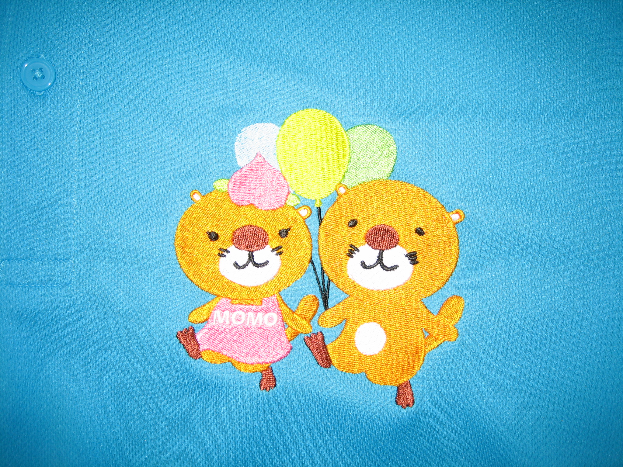 「バルーンラッコ柄」オリジナルポロシャツ制作事例 商品カテゴリ: 4 商品: 504 利用シーン: 加工位置: 左胸 加工サイズ: 横:1100mm×縦:108mm 加工方法: 刺繍 カメオカからのコメント: