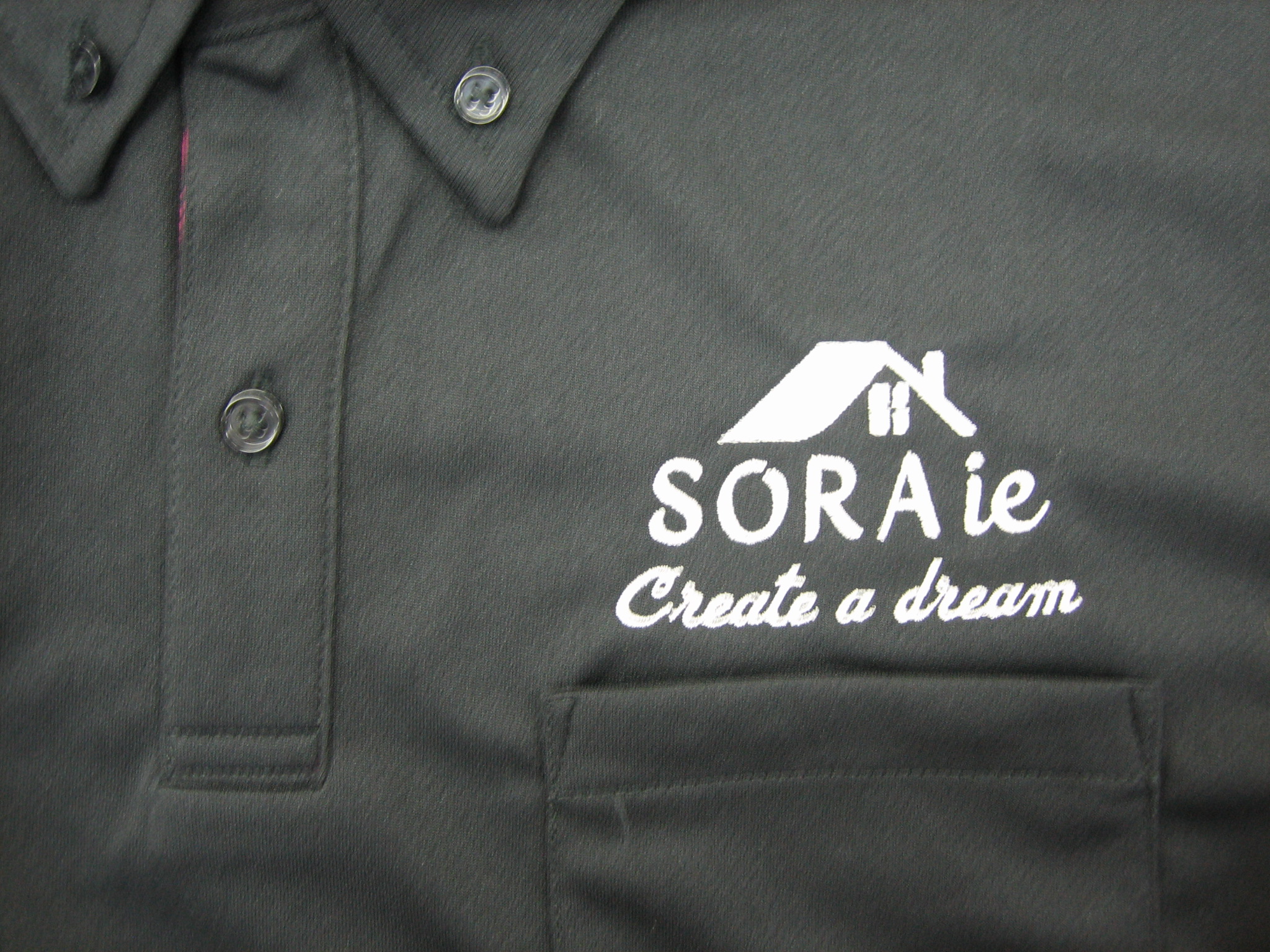 「SORAie」オリジナルポロシャツ制作事例 商品カテゴリ: 4 商品: 831 利用シーン: 加工位置: 左胸・背中裾 加工サイズ: 左胸横80㎜×48㎜ 背中裾横300㎜×縦35㎜ 加工方法: 刺繍 カメオカからのコメント: