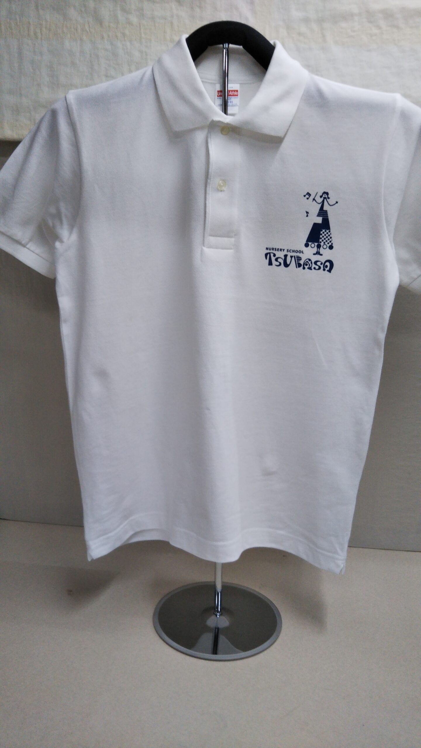 「つばさ保育園ロゴ」オリジナルポロシャツ制作事例 DSC_0064 商品カテゴリ: 4 商品: 888 利用シーン: 加工位置: 左胸 加工サイズ: 縦:100㎜ 加工方法: オリジナルシルクプリント カメオカからのコメント: 5543-01ヘビーウエイトコットンポロシャツの左胸にオリジナルプリントを入れました。かなり大きめのプリントですが良い仕上がりになりました。こちらのポロシャツは数少ないコットン100%素材のポロシャツで毎年人気があります。