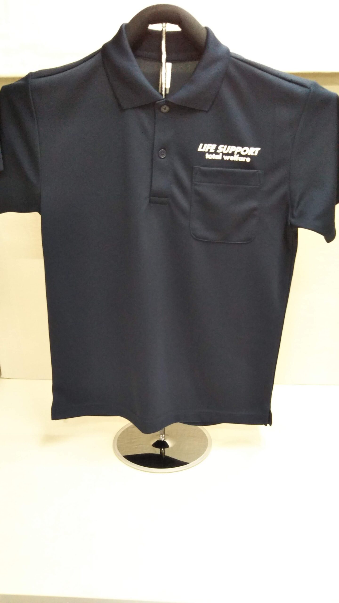 「LIFE SUPPORT」オリジナルポロシャツ制作事例 00010001 商品カテゴリ: 4 商品: 503 利用シーン: 加工位置: 左胸 加工サイズ: 横:100㎜ 加工方法: オリジナルシルクプリント カメオカからのコメント: 大人気アイテム00330-AVPドライポロシャツポケット付きの左胸にオリジナルプリントを入れました。プリントサイズをポケット巾に合わせていて、やや大きめの印象ですね。ポケット巾は大体10cm程度です。