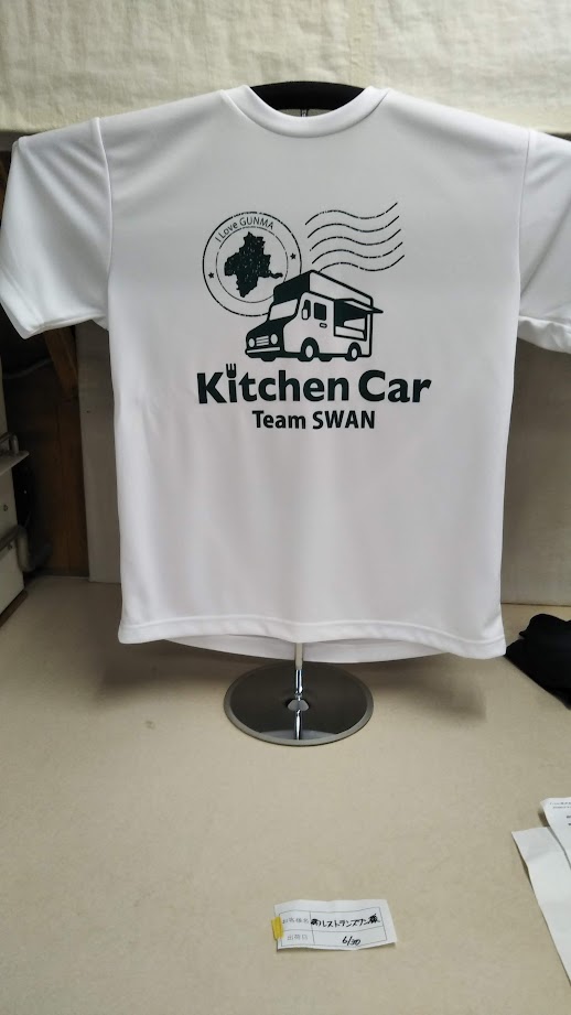 「Kitchen Car Team SWAN」オリジナルTシャツ制作事例 商品カテゴリ: 8 商品: 531 利用シーン: 加工位置: 胸全面 加工サイズ: 横:270mm × 縦:243mm 加工方法: プリント カメオカからのコメント: