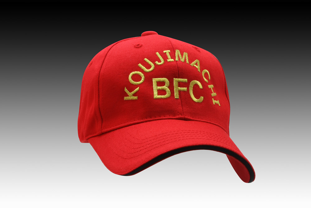 「KOUJIMACHI BFC]オリジナルキャップ制作事例 商品カテゴリ: 2 商品: 294 利用シーン: 加工位置: フロント 加工サイズ: 加工方法: 刺繍 カメオカからのコメント: キャップでは定番のアーチ文字での製作です。失敗の少ない定番のデザインスタイルですね!