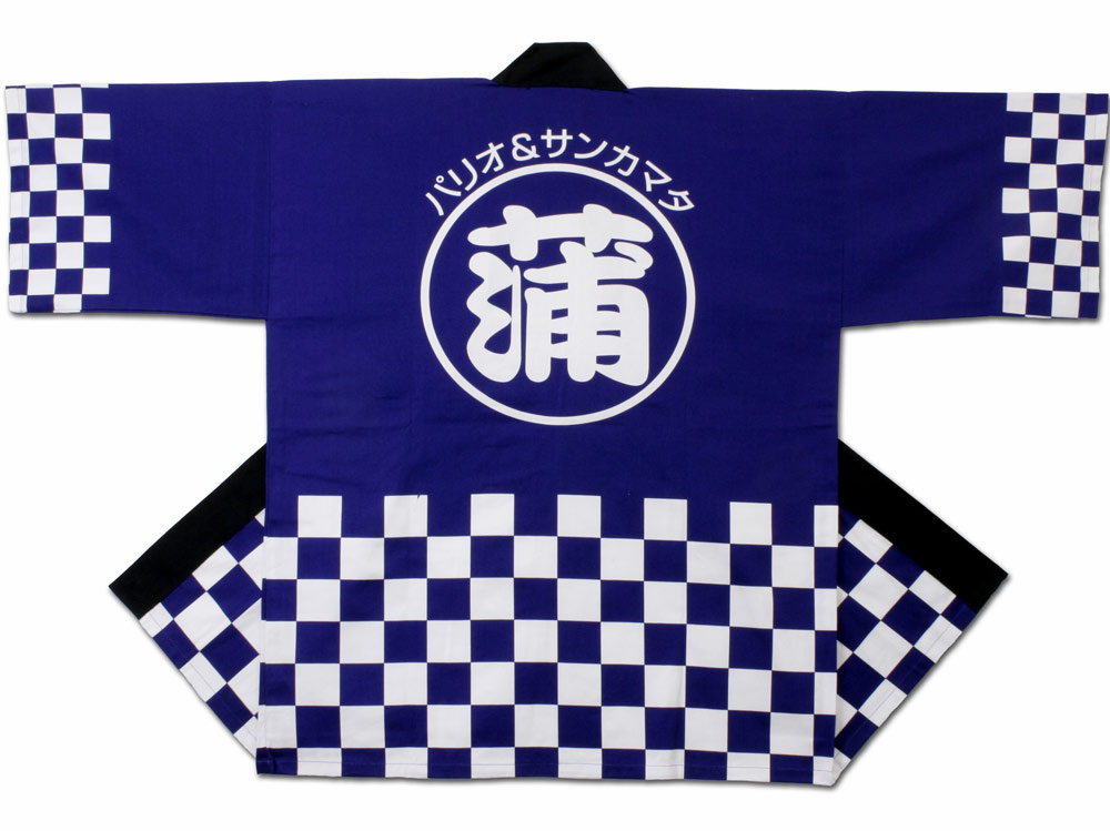 「パリオ&サンカマタ 蒲ロゴ」オリジナルはっぴ制作事例 商品カテゴリ: 1 商品: 269 利用シーン: 加工位置: 衿、背中 加工サイズ: 加工方法: プリント カメオカからのコメント: 背中に約40cm×40cmのプリントをいれました。とっても迫力がある仕上がりです。ここまでプリントが大きいと着用時には見えにくくなるかもしれません。でもとってもインパクトがある仕上がりになりました。