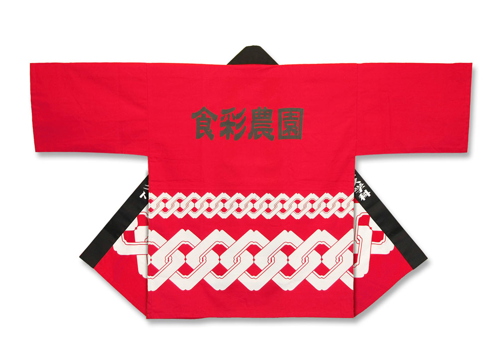 「食彩農園」オリジナルはっぴ制作事例 商品カテゴリ: 1 商品: 272 利用シーン: 加工位置: 衿、背中 加工サイズ: 加工方法: プリント カメオカからのコメント: 両衿と背中の文字が目立ってとっても素敵にしあがりました。