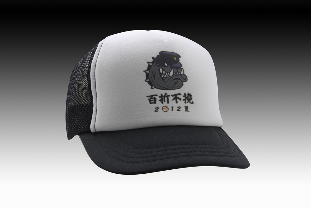 「百折不撓2012夏」オリジナルキャップ制作事例 商品カテゴリ: 2 商品: 290 利用シーン: 加工位置: フロント 加工サイズ: 加工方法: プリント カメオカからのコメント: 迫力ある犬のデザインが特徴のデザインです。プリントも丁度良いサイズで収まってます。