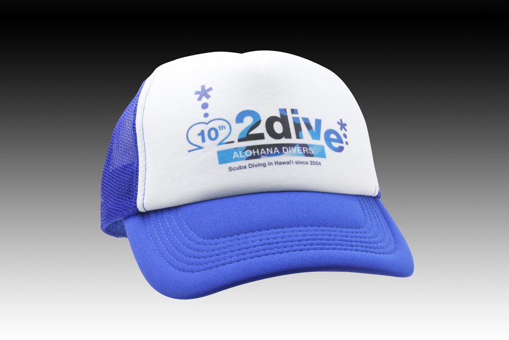 「10th 2dive」オリジナルキャップ制作事例 商品カテゴリ: 2 商品: 290 利用シーン: 加工位置: フロント 加工サイズ: 加工方法: 転写プリント カメオカからのコメント: とてもカラフルなデザインでシルク印刷又は刺繍では表現ができないデザインです。フルカラー転写プリントですと細部にわたり表現することが可能になります。