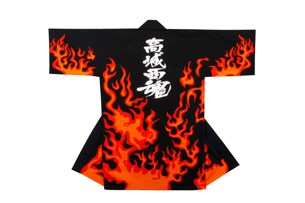 「高城西魂」オリジナルはっぴ制作事例 商品カテゴリ: 1 商品: 276 利用シーン: 加工位置: 背中 加工サイズ: 加工方法: プリント カメオカからのコメント: 勢いある文字が炎柄とマッチしてとってもカッコいい仕上がりになりました。