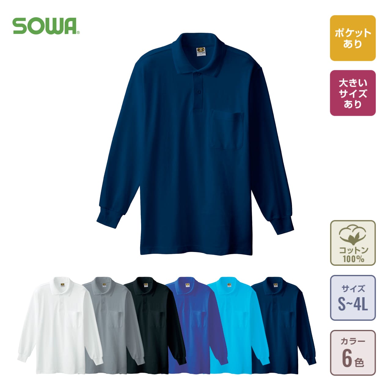 コットン100%長袖ポロシャツ(胸ポケット有)