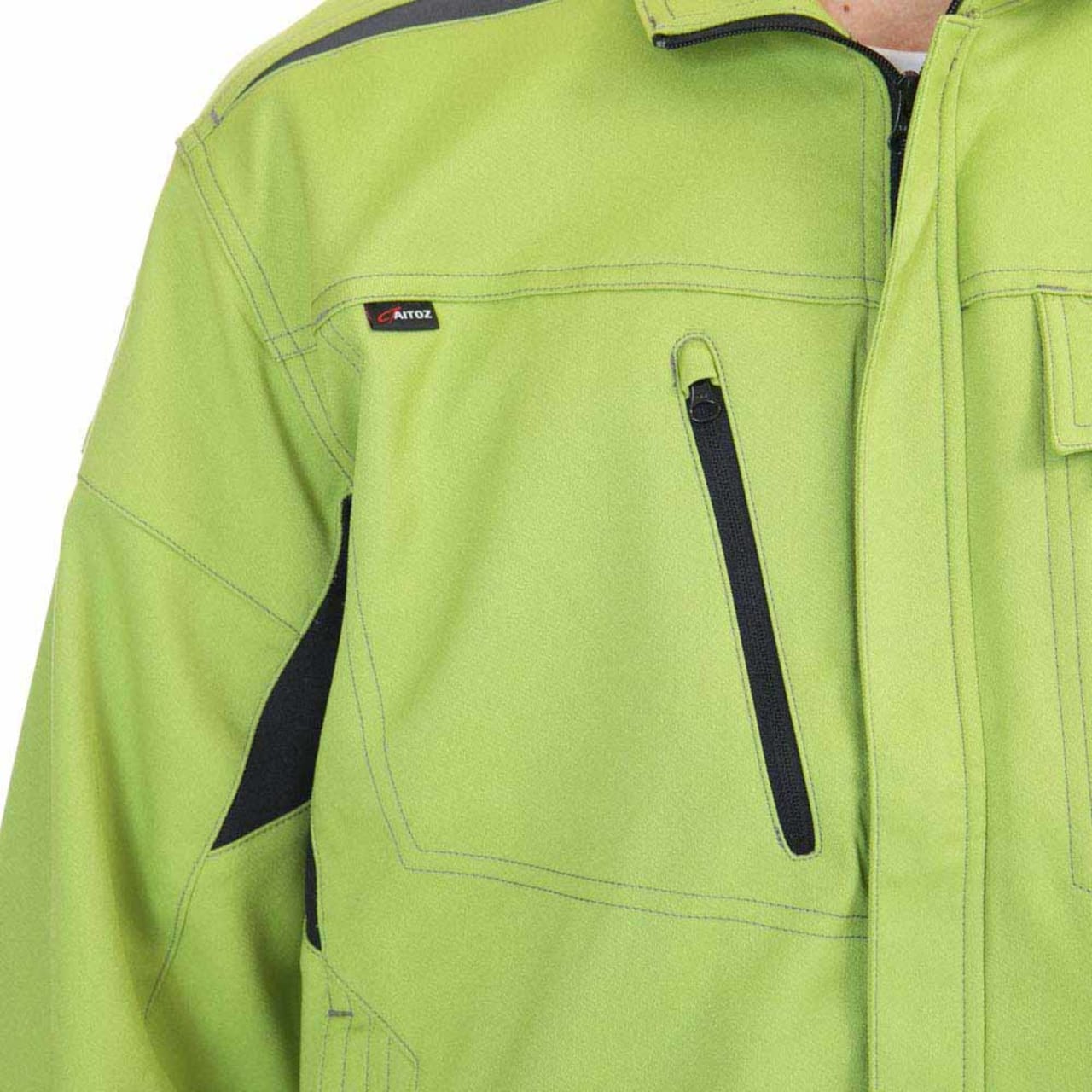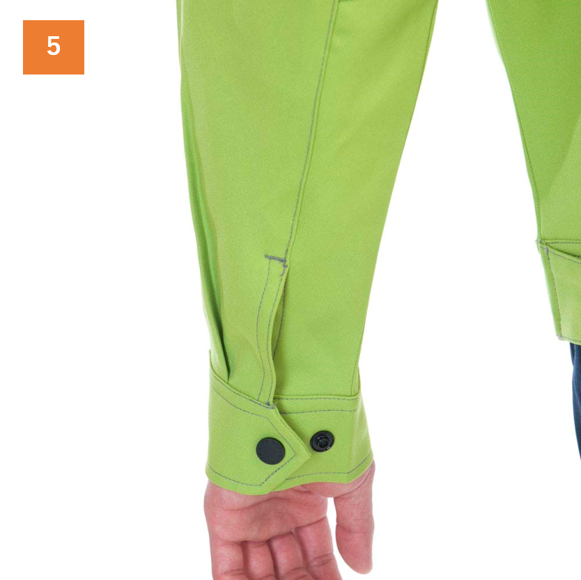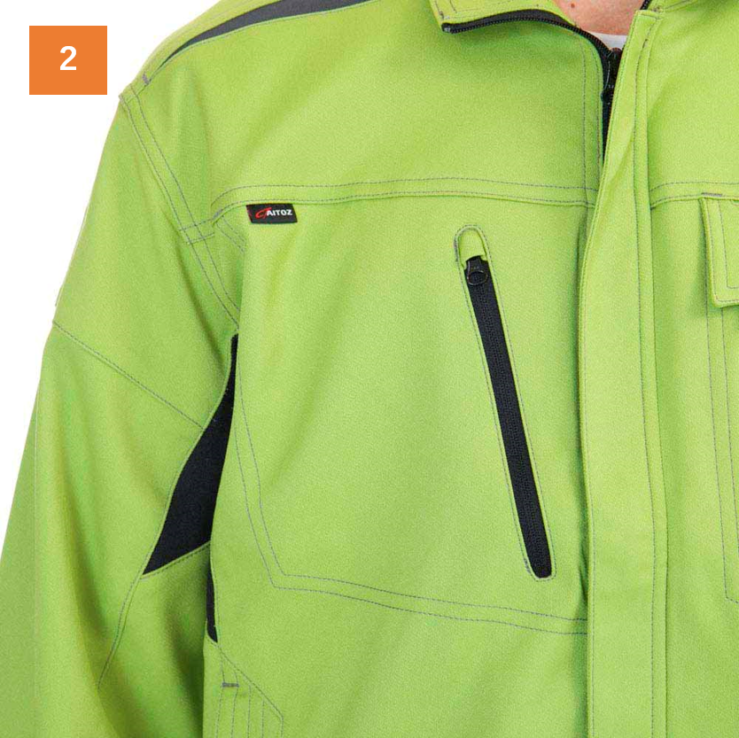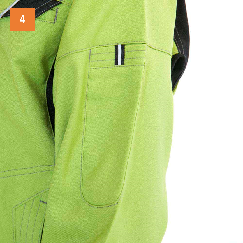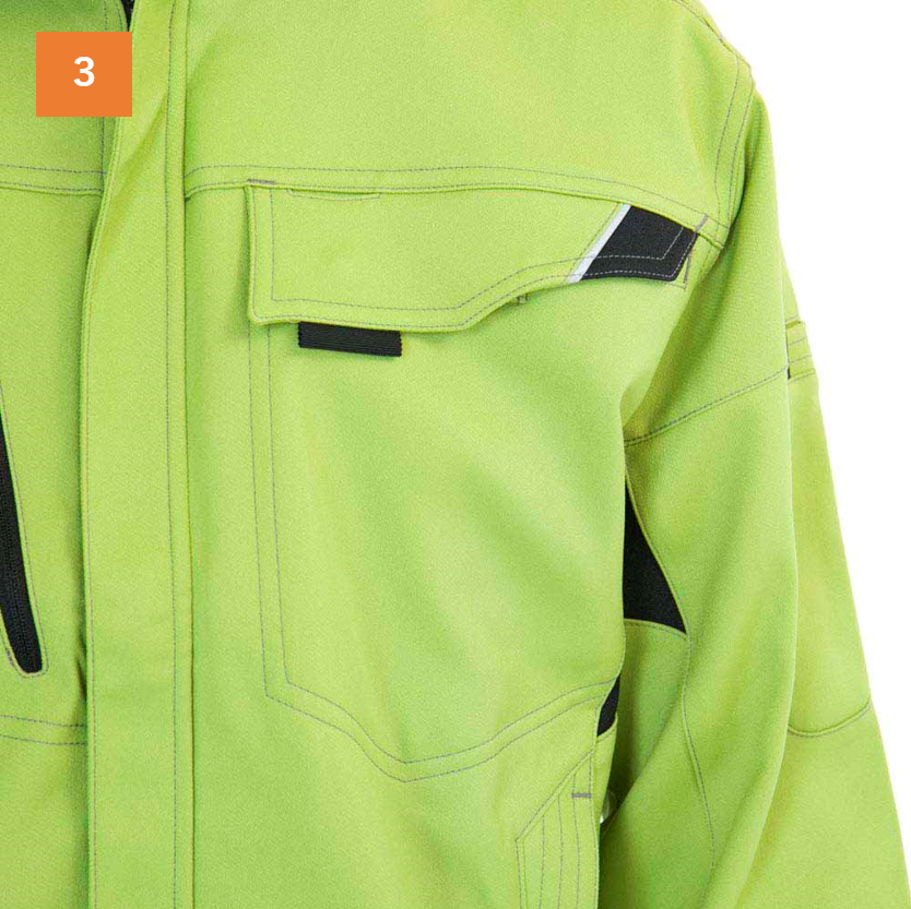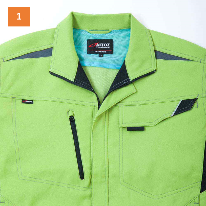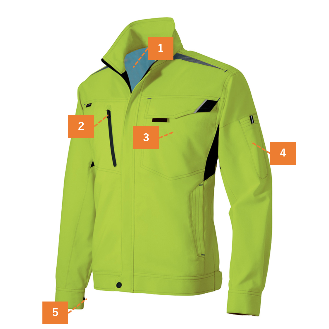 背中や胸ポケットのフラップ、腕のペン差しにも反射材が使用されており、夜間の高い視認性も確保されています。
