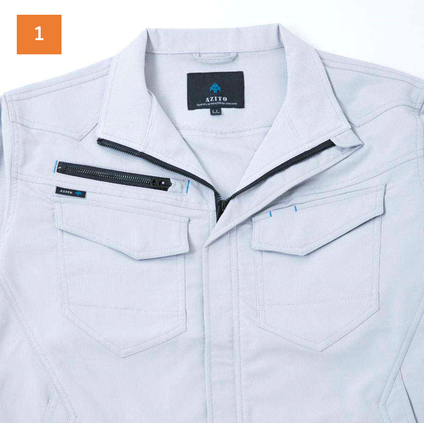 ペン差し・ファスナー付きポケットを備えており、様々なワークシーンで活躍します。