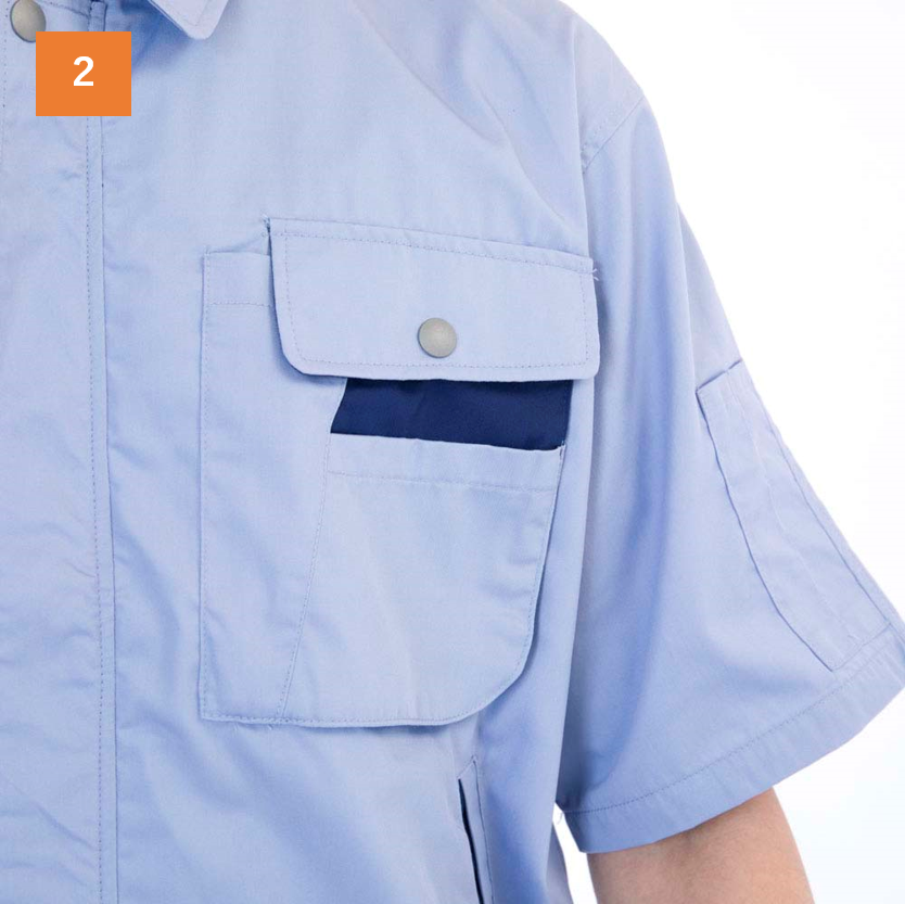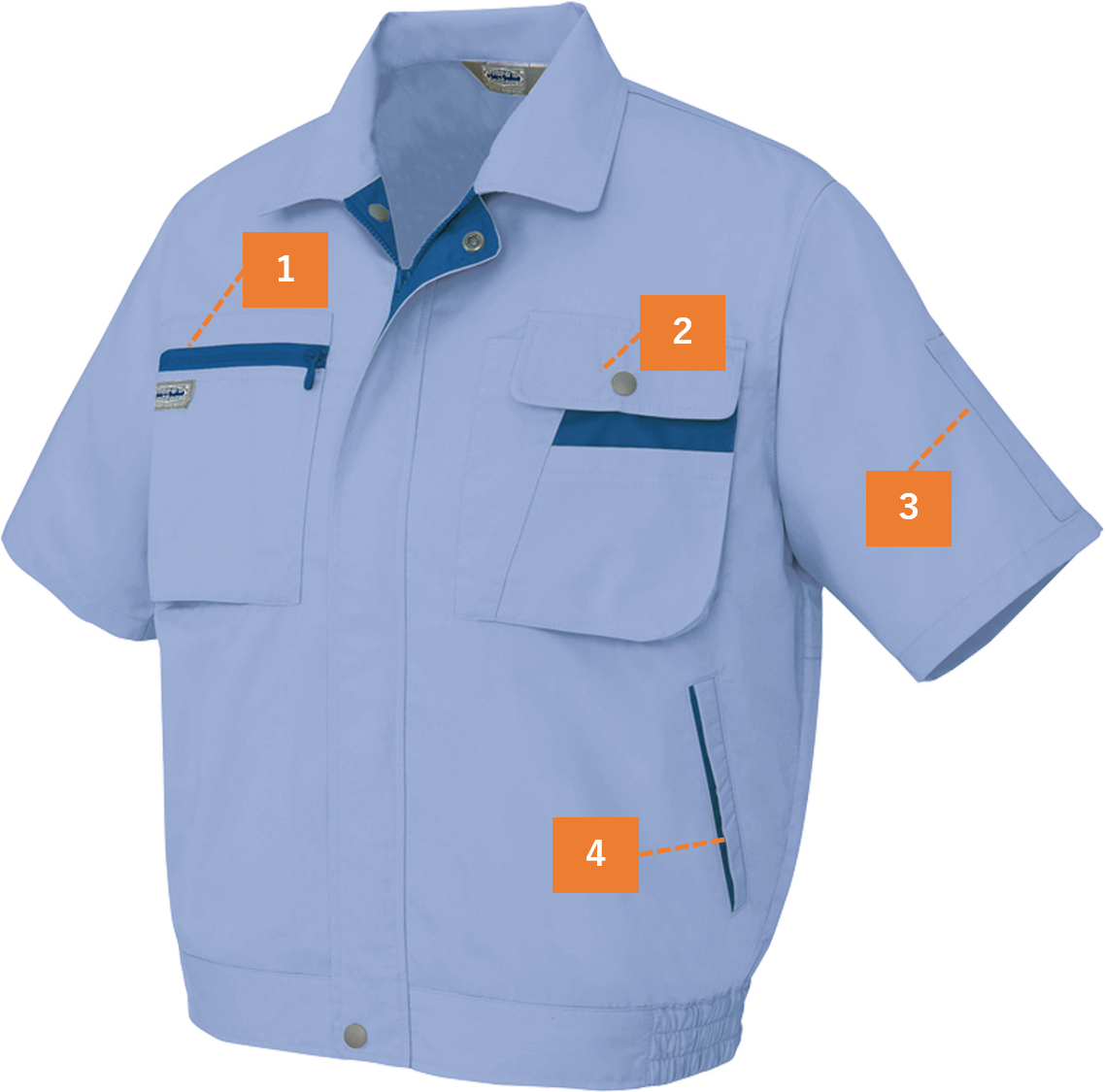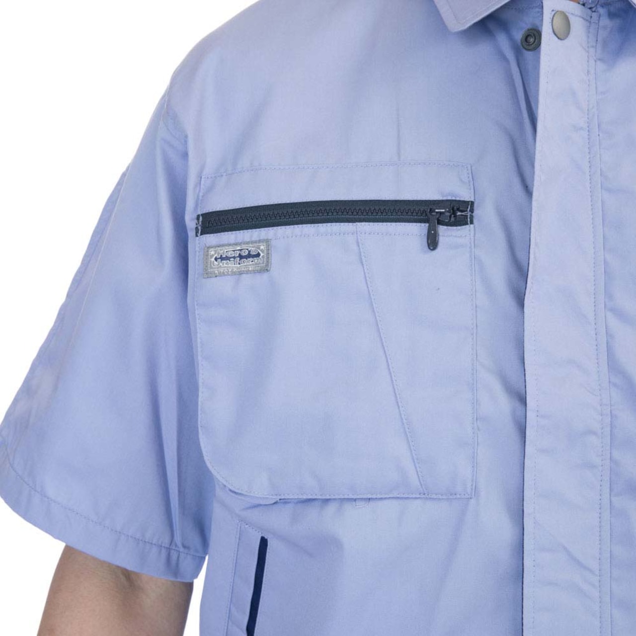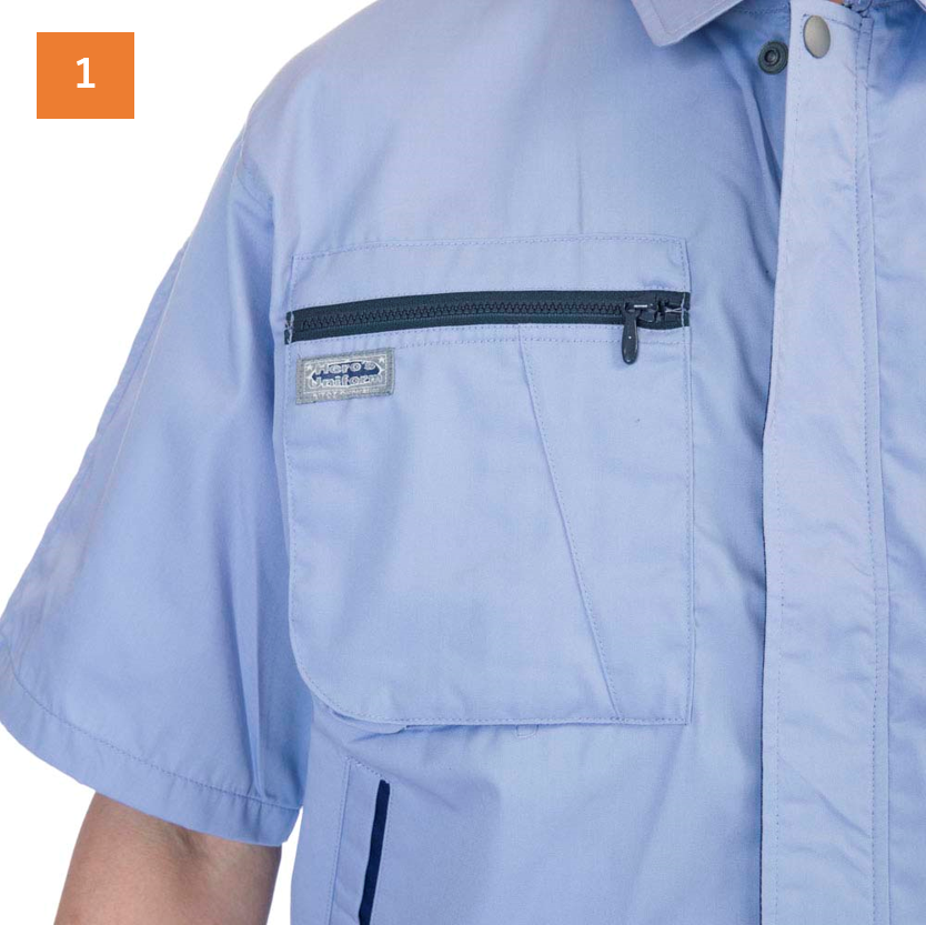 胸ポケットにはそれぞれファスナー、マチ付き。携帯電話固定用のループやサブポケットも。軽い着心地と高い機能性で様々な現場にマッチします。