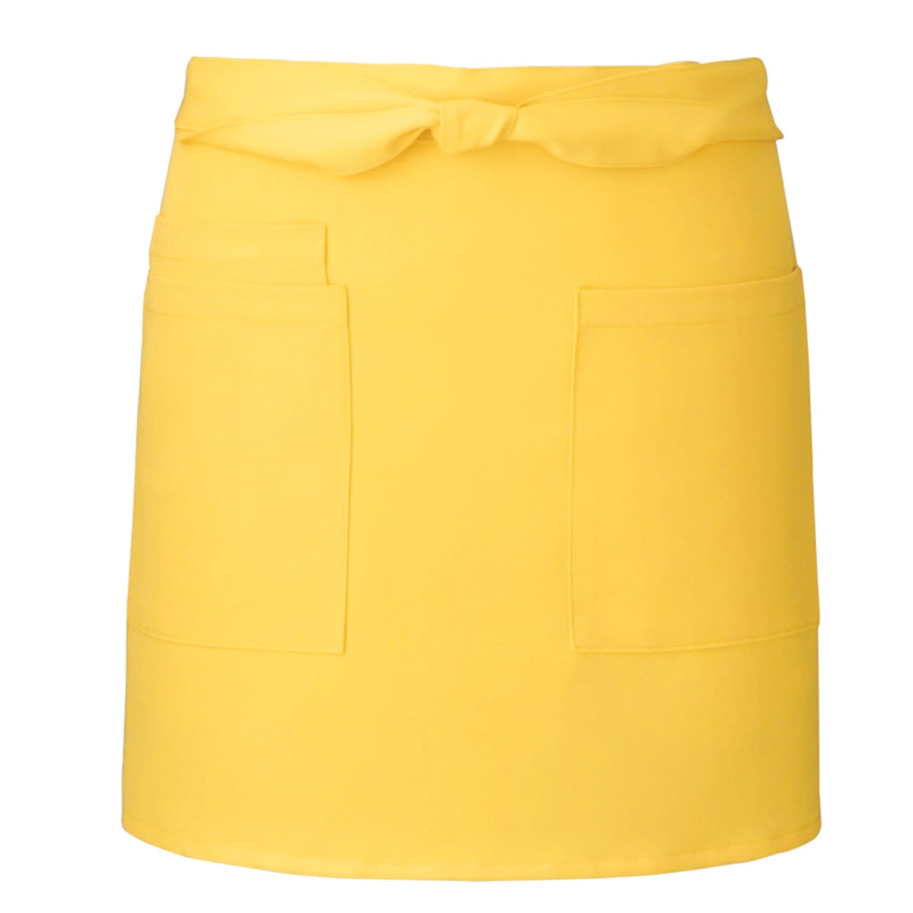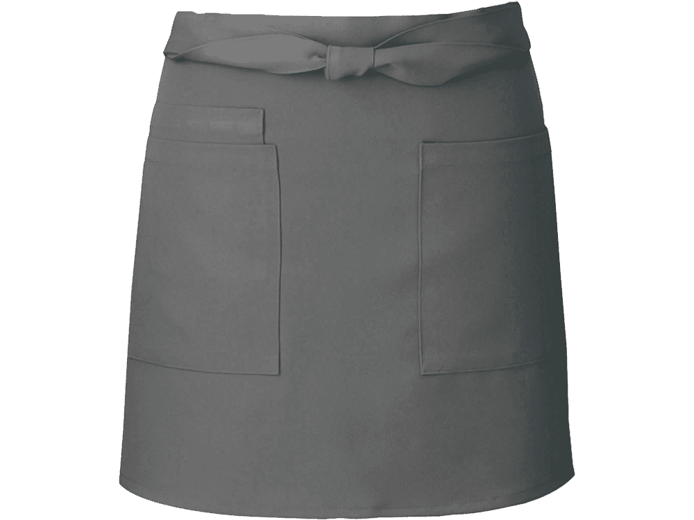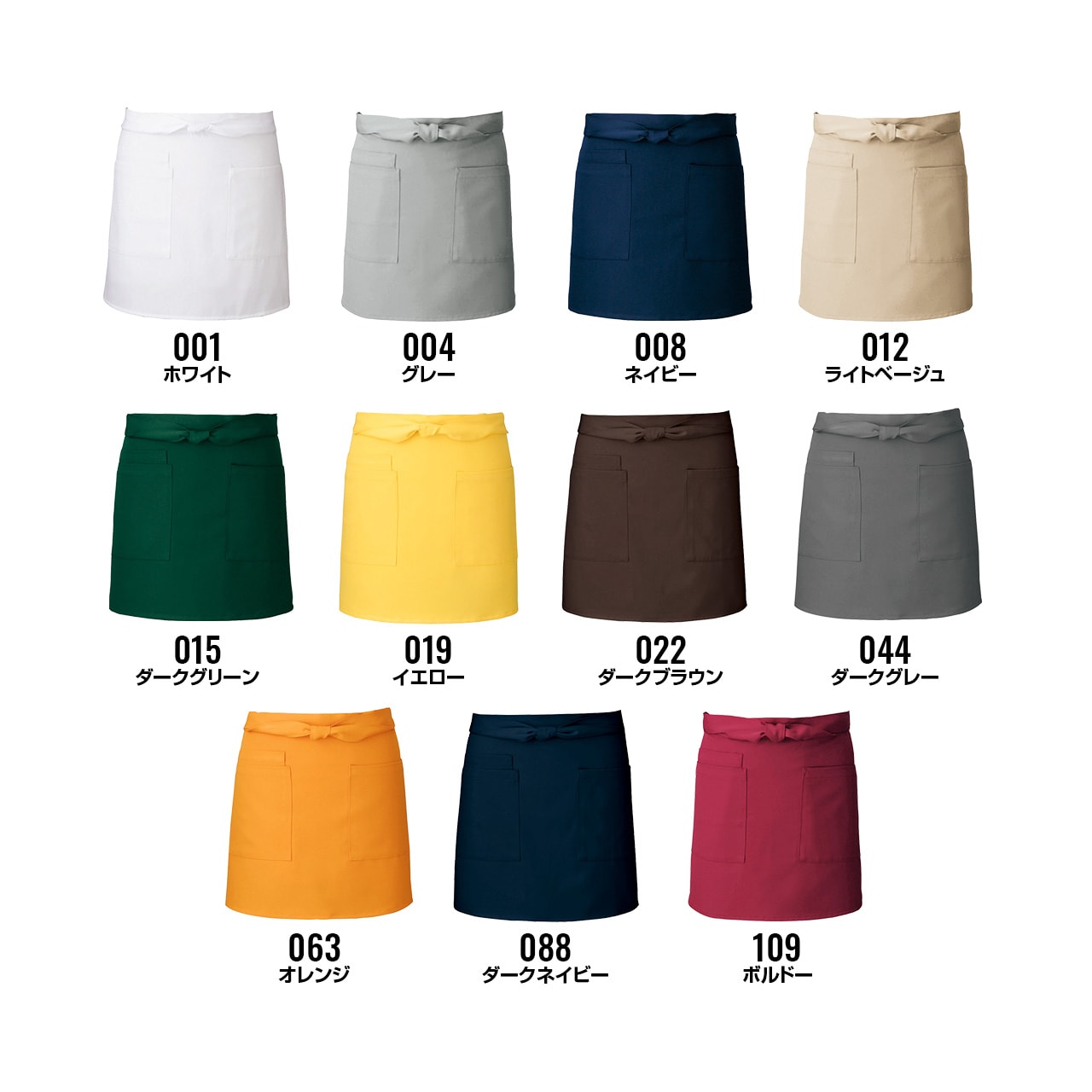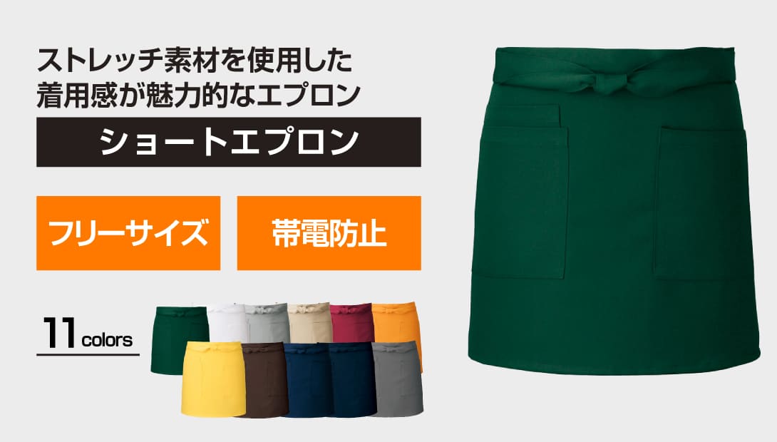 腰巻き仕様。左右ポケット付き。右ポケット内側にミニポケット付き。撥水加工を施した、帯電防止かつストレッチの効いたギャバ素材。ポリエステル100%で耐久性、速乾性が高く、シワにもなりにくくイージーケア。フリー素材で男女兼用。カラーバリエーションはグリーン、レッド、ブラウン、ブラック、ホワイト、グレー、ライトベージュ、ボルドー、オレンジ、イエロー、ダークブラウン、ダークグリーン、ネイビー、ダークネイビー、ダークグレーの幅広い15色展開。同素材のミドル丈、ロング丈の展開あり。