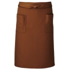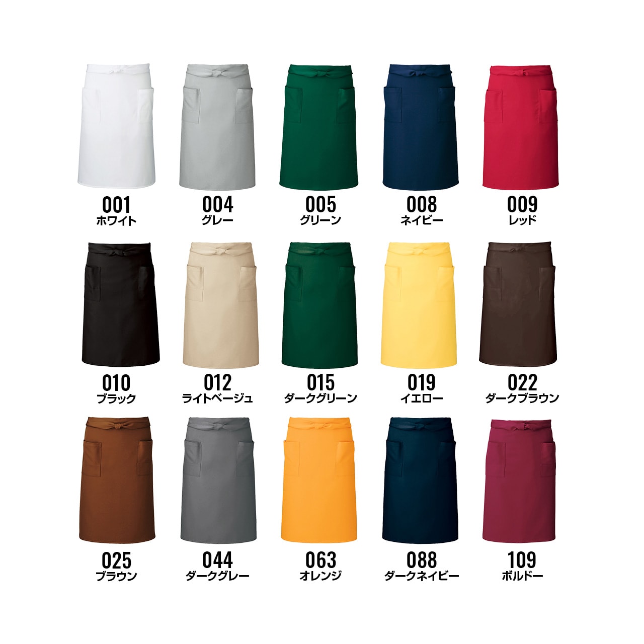 腰巻き仕様。左右ポケット付き。撥水加工を施した、帯電防止かつストレッチの効いたギャバ素材。ポリエステル100%で耐久性、速乾性が高く、シワにもなりにくくイージーケア。フリーサイズで男女兼用。カラーバリエーションはグリーン、レッド、ブラウン、ブラック、ホワイト、グレー、ライトベージュ、ボルドー、オレンジ、イエロー、ダークブラウン、ダークグリーン、ネイビー、ダークネイビー、ダークグレーの幅広い15色展開。同素材のショート丈、ロング丈の展開あり。