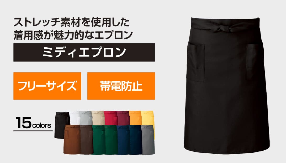 ストレッチで適度に体にフィットする着用感が魅力の腰エプロン。帯電防止、撥水と機能性を兼ね備え、チリやホコリを寄せ付けにくく、まとわりつきも軽減し作業も快適です。ポリエステル100%でシワになりにくく、イージーケア。ミドル丈はきちんと感もあり、ロング丈よりも足捌きが良く、飲食店では接客からキッチンスタッフまで幅広く対応します。シンプルなデザインでベーシックカラーからアクセントカラーまで、豊富な15色展開でお店の雰囲気に合わせてお選びいただけます。