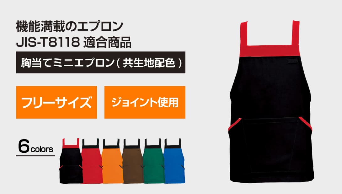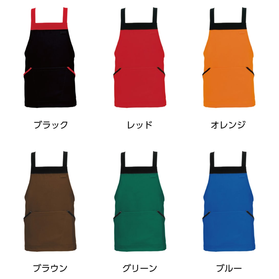 【JIS-T8118適合】帯電防止機能付き。H型仕様。着脱が簡単なジョイント(バックル)を使用。左胸名札ループ付き。左右ポケット付き。右ポケット内側にペン差しポケット付き。ポリエステル100%のタッサー生地で耐久性に優れ、シワにもなりにくくイージーケア。フリーサイズで男女兼用。カラーバリエーションはブラック、レッド、オレンジ、ブラウン、グリーン、ブルーの6色展開。同素材のロング丈、腰巻きエプロンの展開あり。