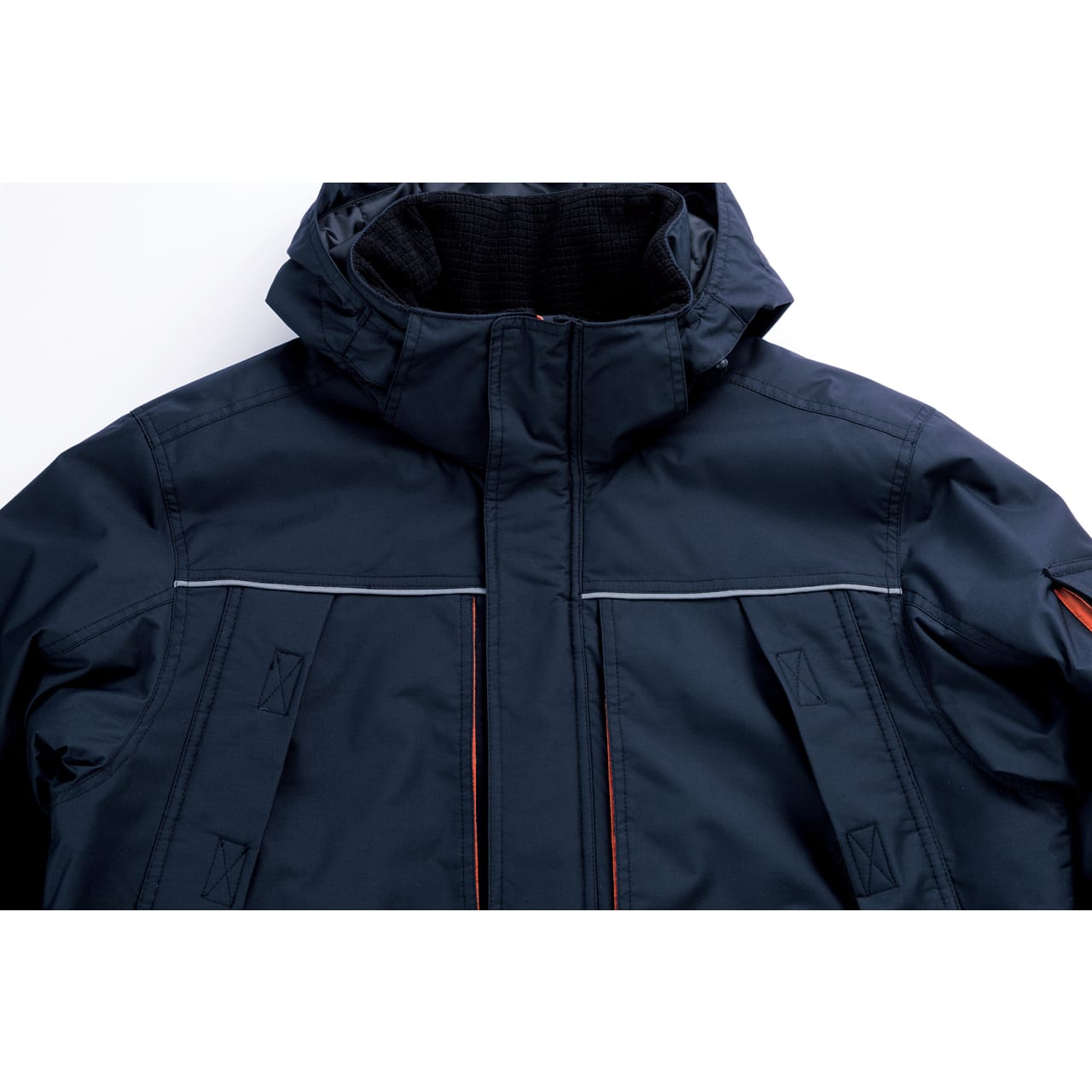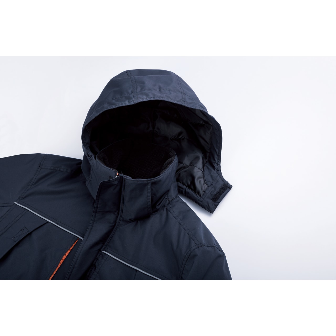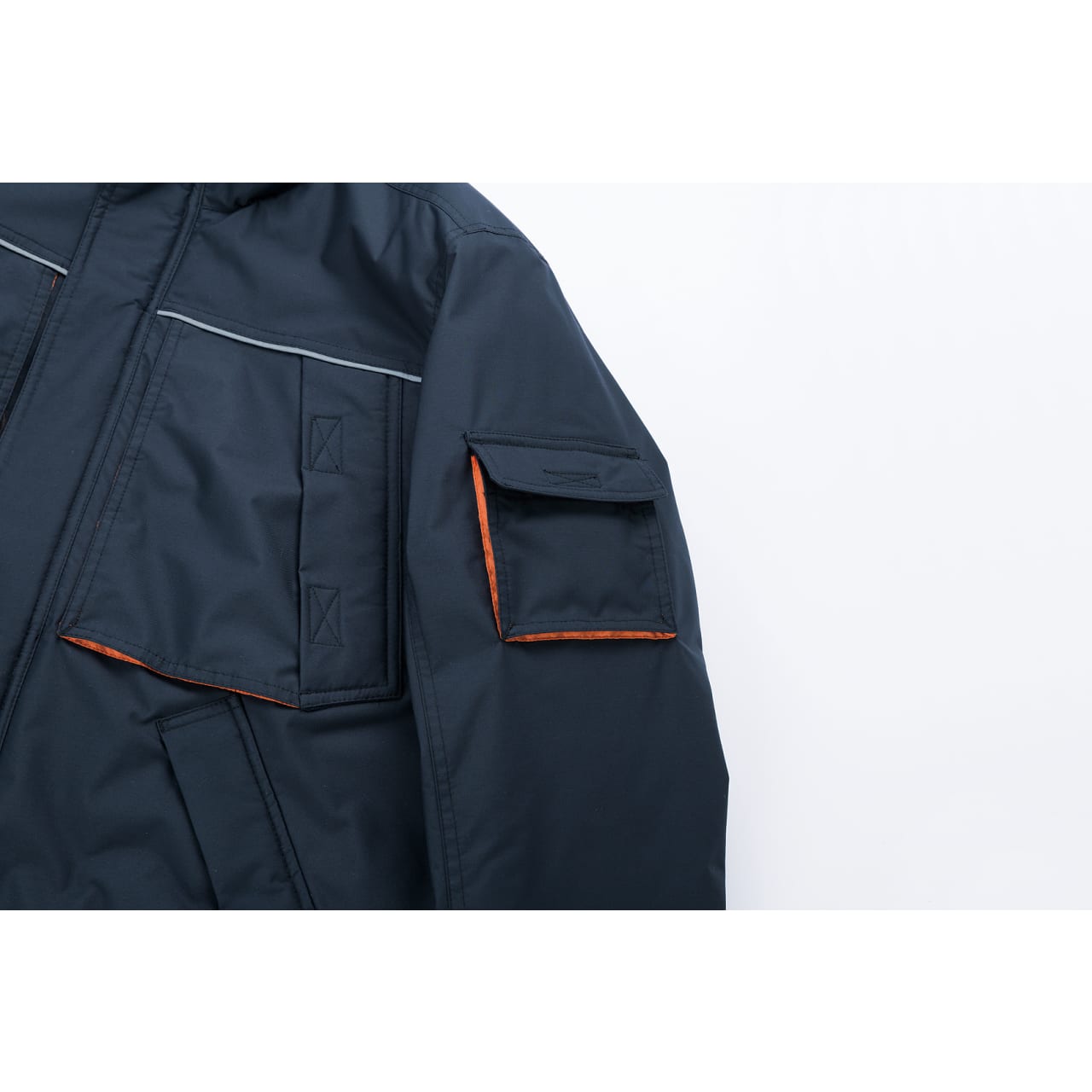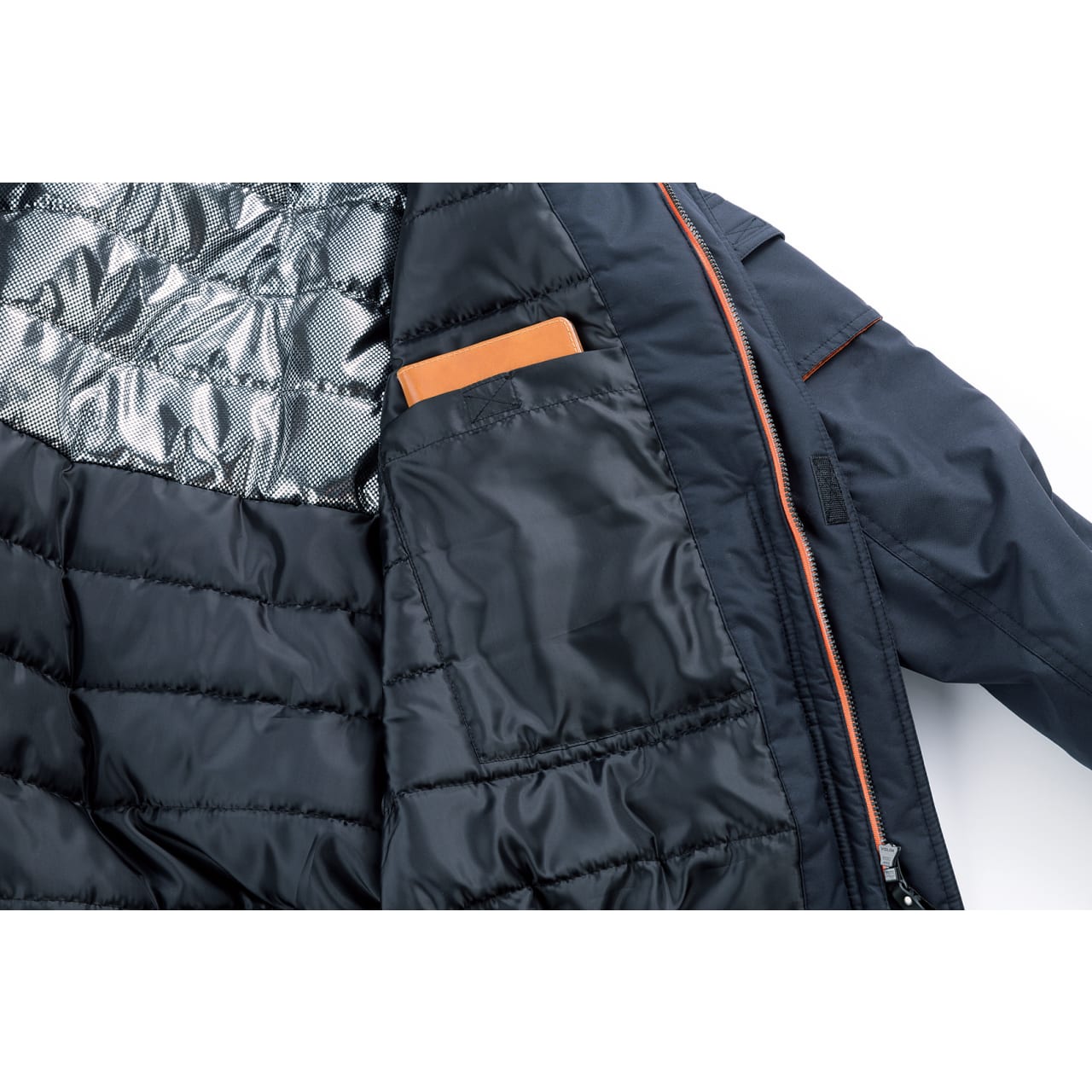 着用しているうちに、どうしても厚みが減少してしまいがちな中綿を、高機能中綿素材を使用することで改善させています。裏地にアルミプリントを施し、さらに保温性を高めているのも嬉しいポイント。耐水性にも優れており、急な雨にも対応します。反射テープがあしらわれているため、夜間の作業にもぴったり。袖にはジャージの内袖がついているので、冷たい風もシャットアウトします。