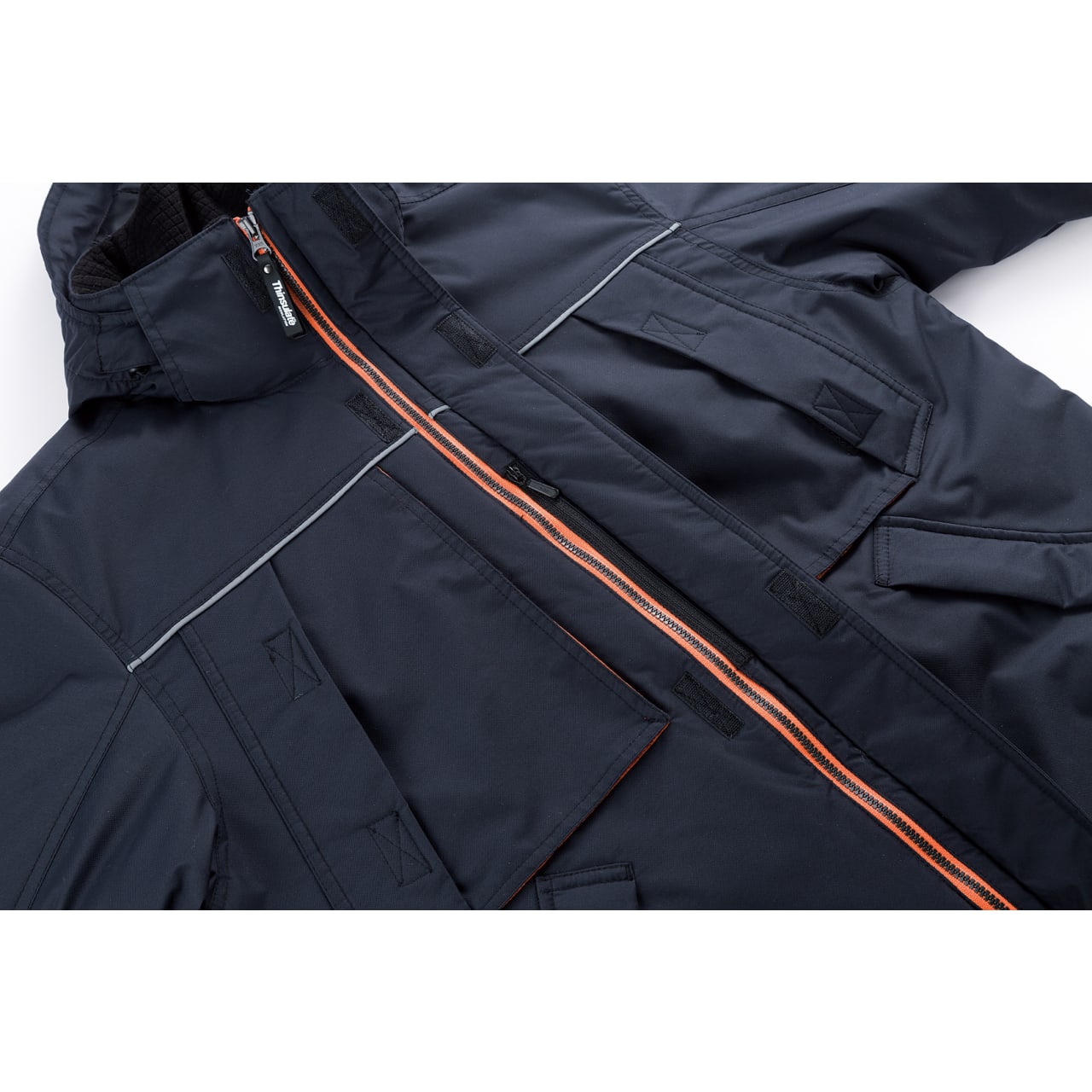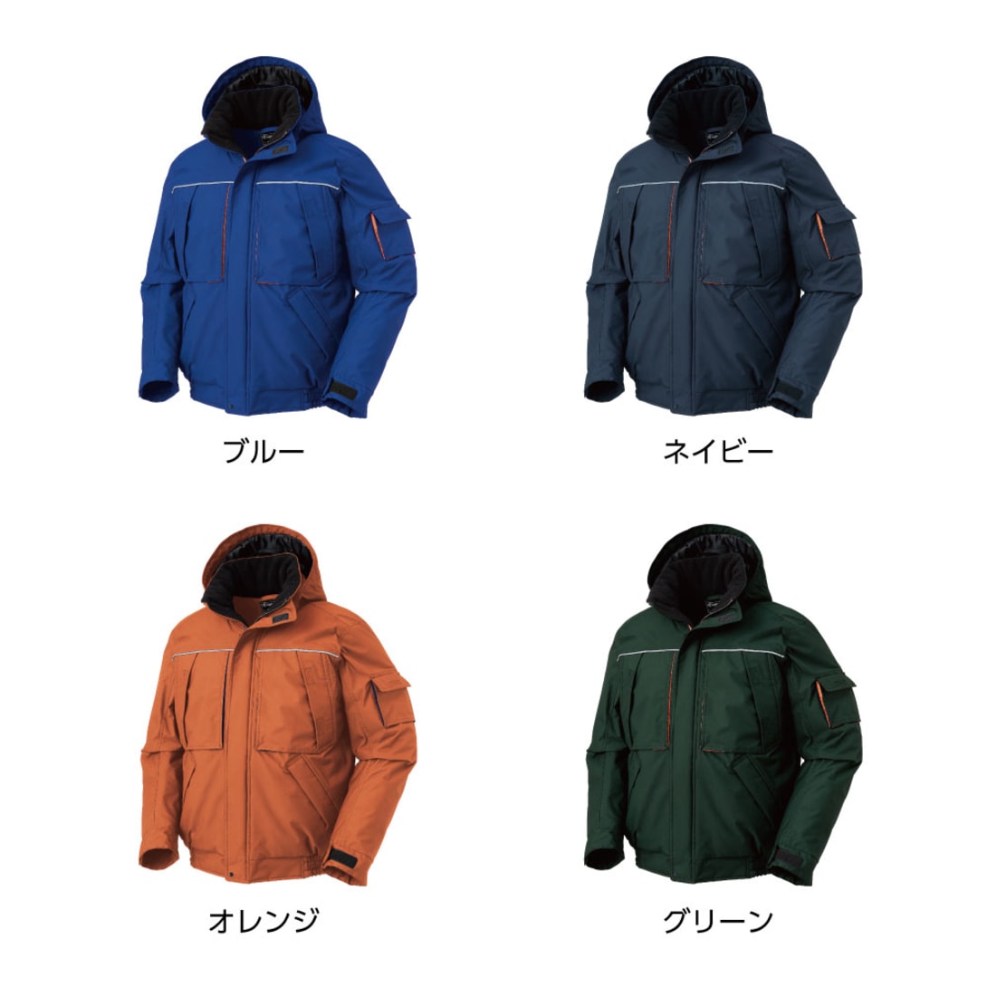 耐水圧10000mm、透湿性5000gの防水・防寒性が優れた防水防寒ジャンパー。保温性は裏地のアルミプリントと中綿の高機能素材シンサレートハイロフトから生まれており、魔法瓶と同じ効果で適温をキープする仕組みになっています。 独特の光沢を放つ表地には、ナイロン(ヘリンボン)が使用されており、杉綾織りから特注の風合いが生まれています。多数のポケットや袖マジックテープ、着脱式フードなどの便利機能もたくさんあり、作業効率が上がるはずです!カラーはネイビー、オレンジ、ブルー、グリーンの4色、サイズはS〜7Lまで用意されています。